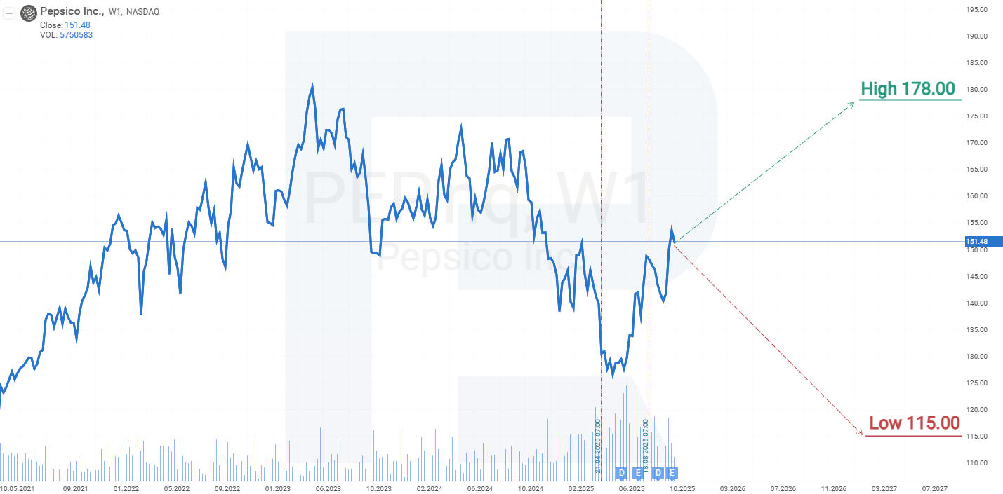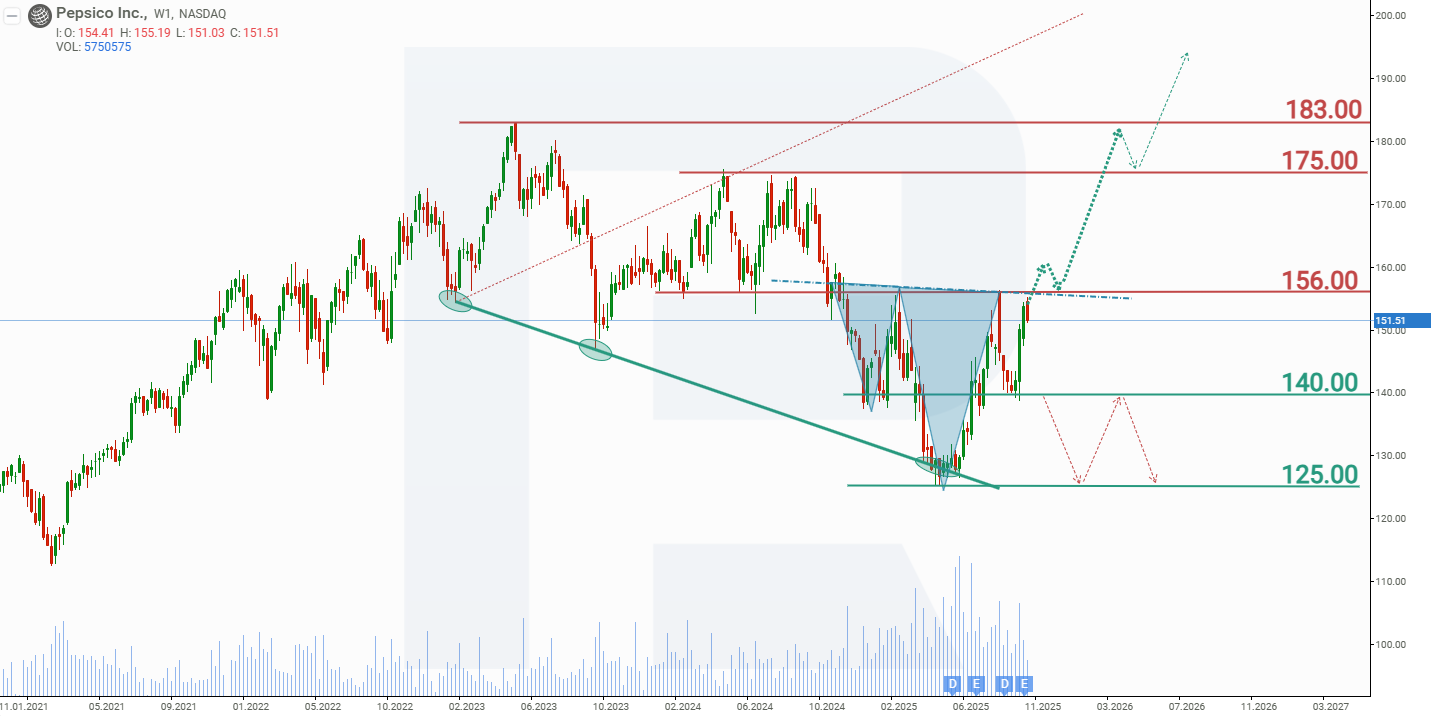 Haftalik grafikda PepsiCo aksiyalari “teskari Bosh va Yelka” (inverse Head and Shoulders) shaklini hosil qilgan. PEP 2023 yil may oyidan beri pasayish trendida bo‘lganini hisobga olganda, ushbu shaklning hosil bo‘lishi tuzatish bosqichi yakunlanayotganini va aksiyalar tez orada o‘sish harakatini qayta boshlashi mumkinligini ko‘rsatadi. Joriy narx dinamikasiga asoslanib, 2025 yil uchun PepsiCo aksiyalarining ehtimoliy ssenariylari quyidagicha: