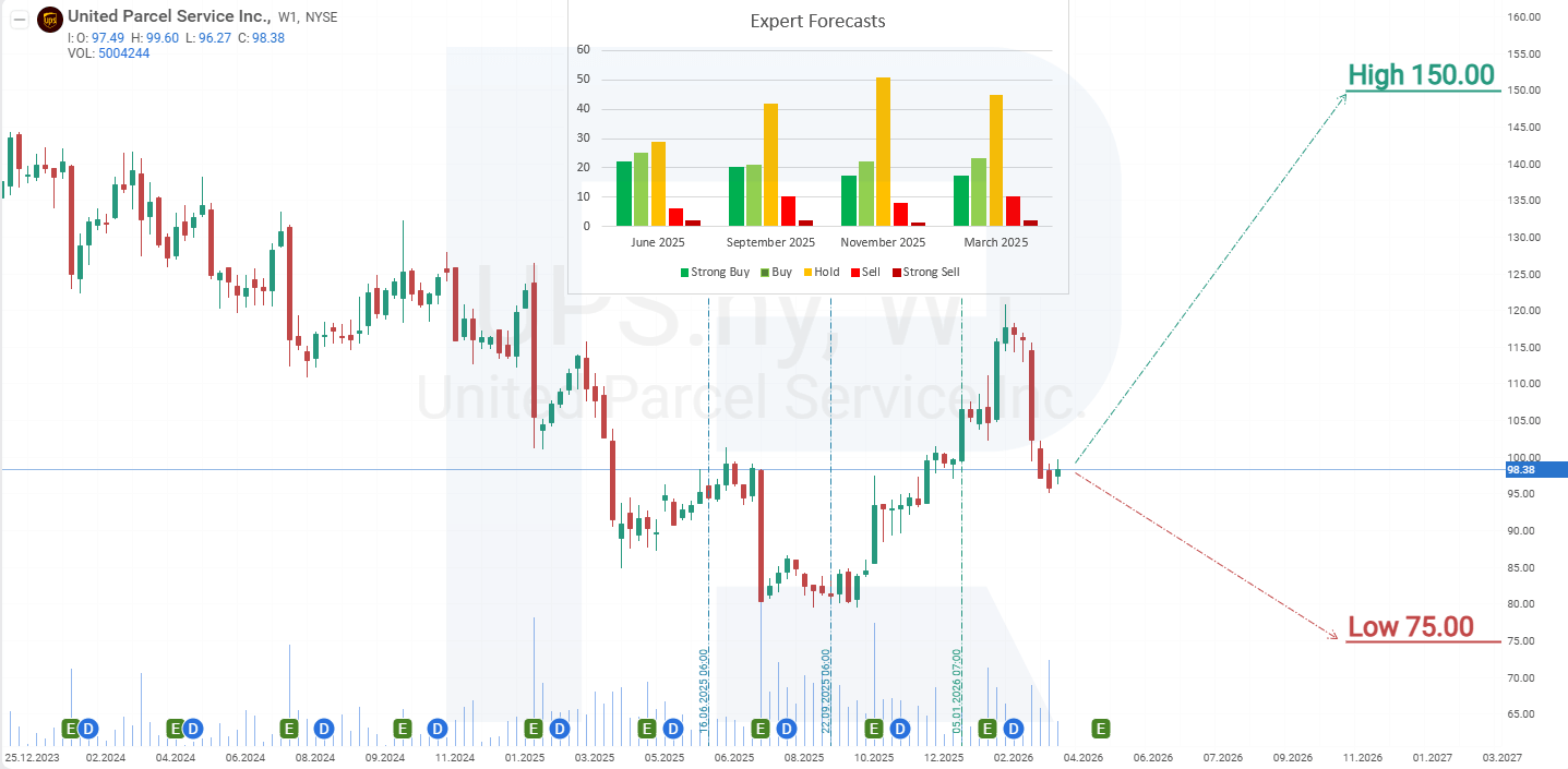 UPS aksiyalari bo‘yicha muqobil prognoz 88 USD qo‘llab-quvvatlash darajasidan pastga yorib o‘tishni nazarda tutadi. Ushbu ssenariyda aksiya narxi 70 USD gacha tushishi mumkin, shundan so‘ng kengroq o‘sish trendining qayta tiklanishi kutiladi. Ushbu pasayish xavfi uchun asosiy omil AQSh makroiqtisodiy muhitining yomonlashuvi bo‘lib, bu iste’mol faolligini susaytirishi va logistika xizmatlariga talabni kamaytirishi mumkin.