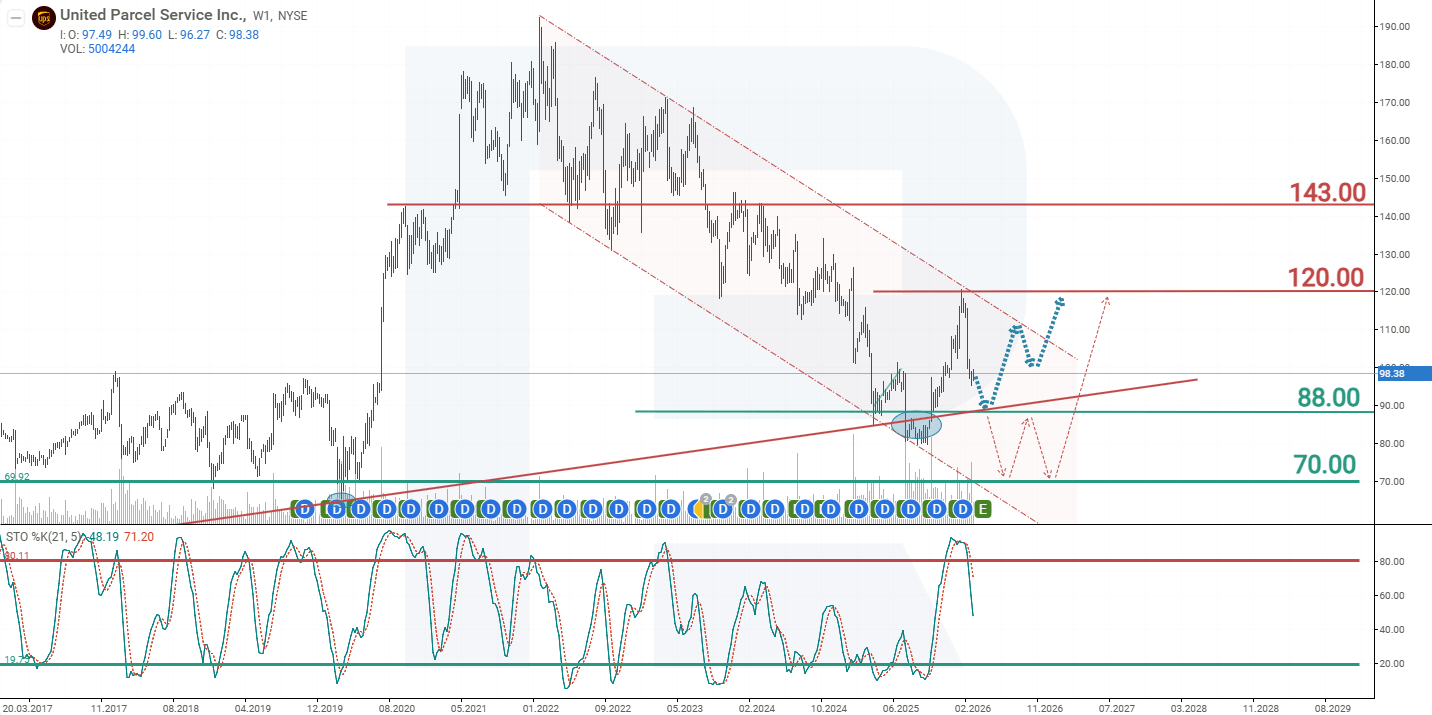 UPS foyda bo‘yicha kutilmalardan oshib ketdi va 2026 yil uchun mo‘tadil ijobiy prognoz berdi, biroq aksiyalar hanuz pasayuvchi kanal ichida qolmoqda. Asosiy ssenariy 88 USD dagi qo‘llab-quvvatlash darajasini sinashni nazarda tutadi, shundan so‘ng 120 USD tomon qaytish ehtimoli bor.