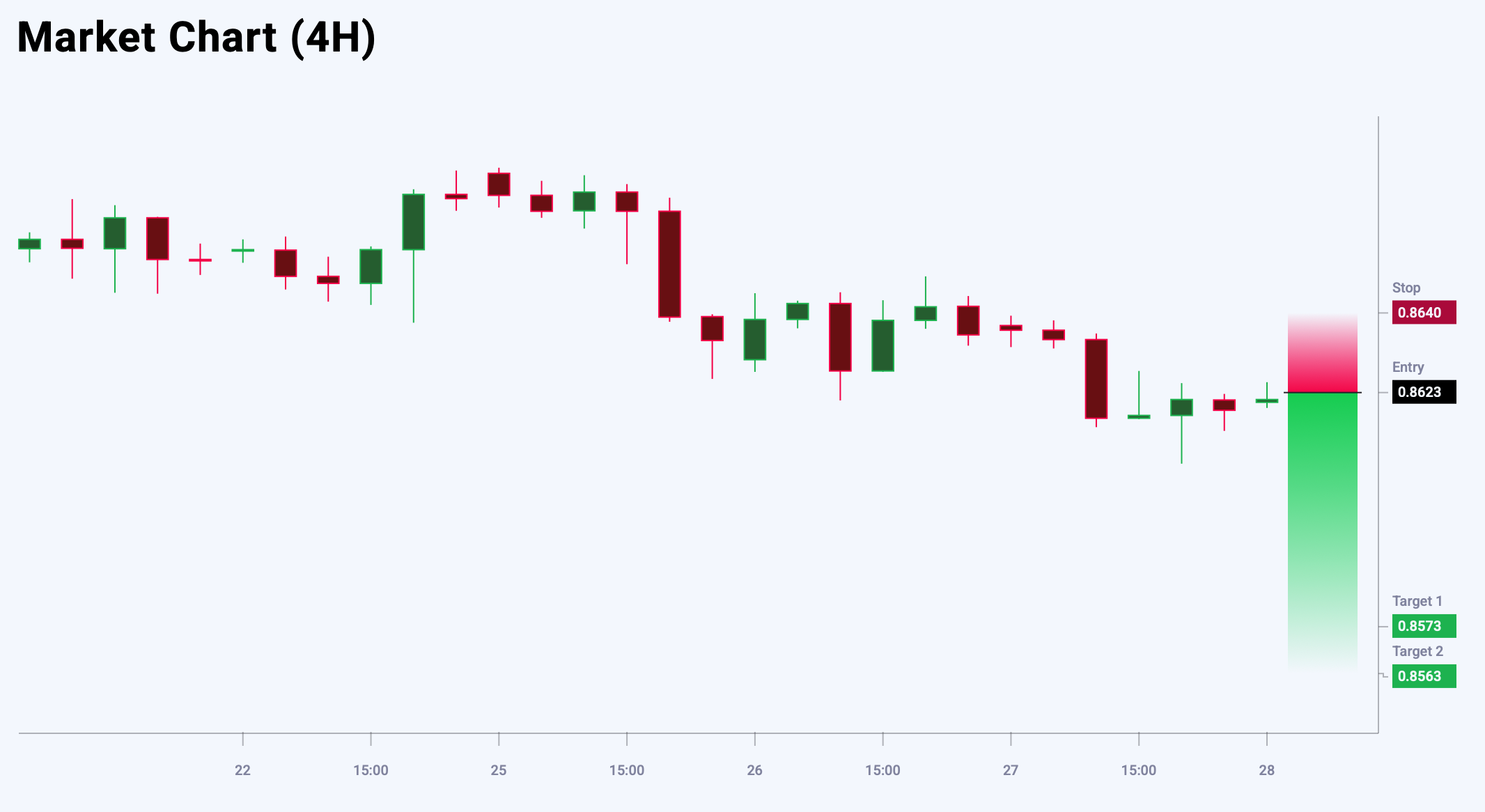 Qisqa muddatli EURGBP prognozi bearishligicha qolmoqda, juftlik qo‘llab-quvvatlash zonasini sinashda davom etmoqda. Sotuv bosimi saqlanmoqda, soatlik grafikdagi eng yaqin qarshilik darajasi 0.8623 da joylashgan. Savdo hajmining pasayishi bearish istiqbolni kuchaytirmoqda va qarshilikdan qaytish sotish uchun jozibali risk/foyda nisbatini taqdim etadi. Bugungi EURGBP savdo g‘oyasi Sell Limit kutilayotgan buyurtmasini joylashtirishni tavsiya qiladi.