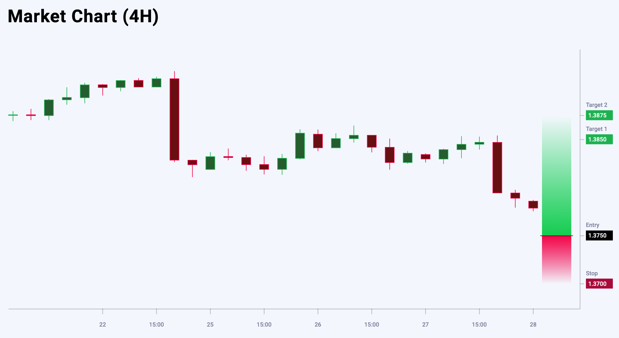 Qisqa muddatli USDCAD prognozi bearish pasayishga qaramay bullishligicha qolmoqda. Tuzatish chuqurlashishi mumkin, ammo pasayish umumiy o‘sish trendini buzish uchun yetarli emas. 1.3800 darajasi yuqoriga yorib o‘tilsa, bullish impuls tasdiqlanadi va keyingi maqsad 1.3875 bo‘ladi. Qisqa muddatli RSI allaqachon ijobiy dinamikani ko‘rsatmoqda. Bugungi USDCAD savdo g‘oyasi Buy Limit kutilayotgan buyurtmasini joylashtirishni tavsiya qiladi.