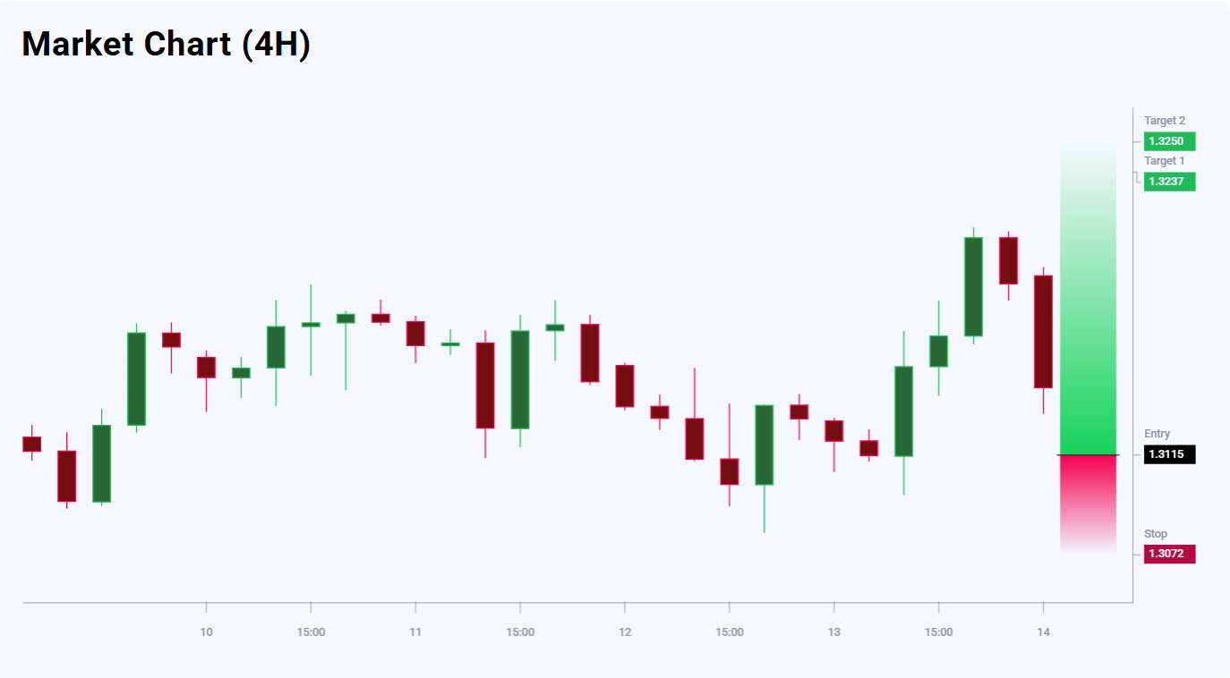 GBPUSD bo‘yicha bozor kayfiyati pasayish tarafida — 69% ga 31%. Xavf/foyda nisbati 1:3 dan yuqori. Ehtimoliy foyda birinchi take-profitda 122 punkt, ikkinchisida 135 punkt, mumkin bo‘lgan yo‘qotish esa 43 punkt bilan cheklangan.