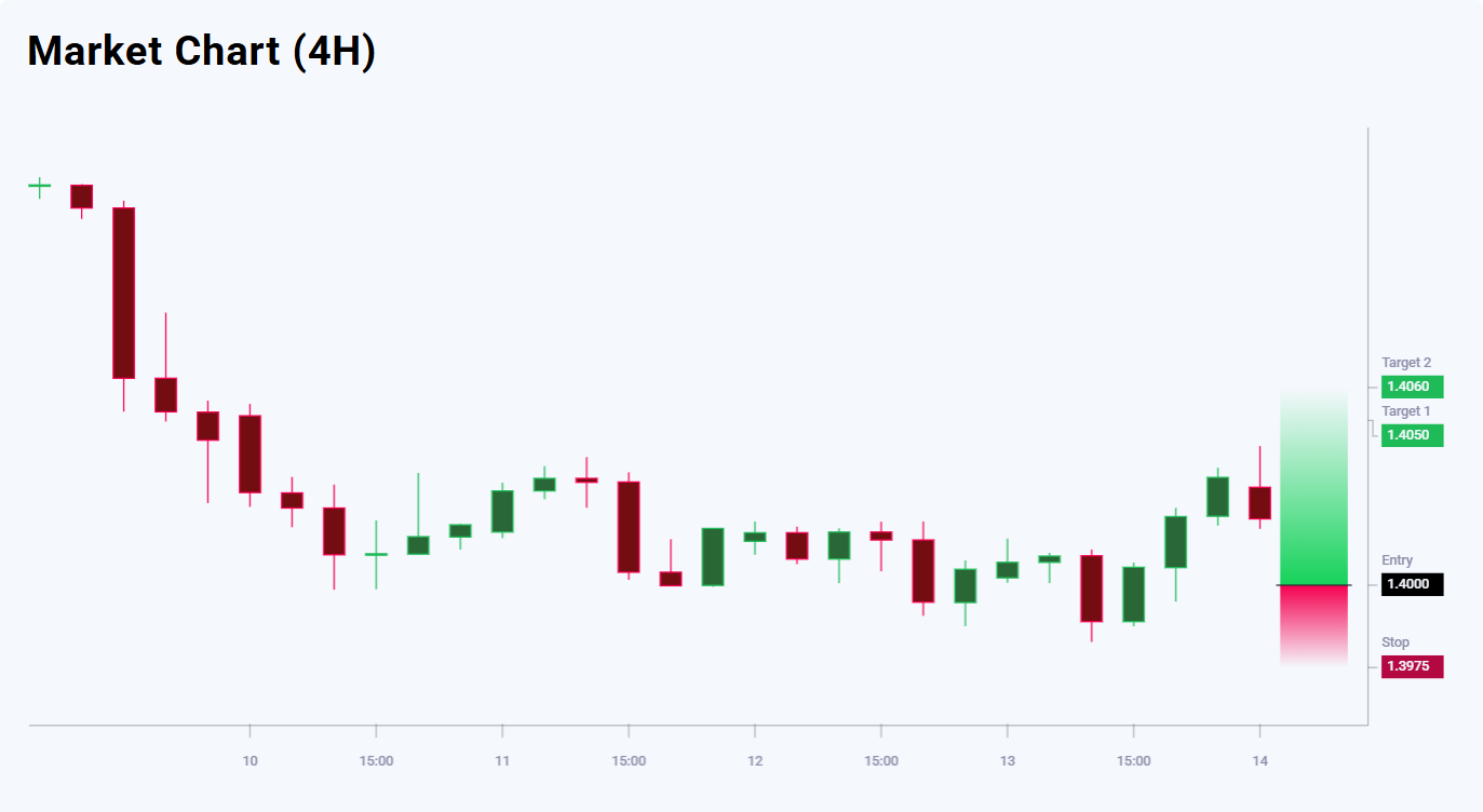 USDCAD juftligidagi o‘sish trendining tugaganiga hali aniq ishoralar yo‘q, biroq qisqa muddatli orqaga chekinish (korreksiya) ehtimoli mavjud. Shu sababli, afzal strategiya — qisqa tuzatishdan keyin tor stop-loss bilan sotib olish va o‘sish impulsining davom etishini kutishdir. 1.4040 darajasidan yuqoriga chiqish o‘sish impulsini tasdiqlaydi. Bugungi USDCAD savdo g‘oyasi kutilayotgan Buy Limit buyurtmasini joylashtirishni tavsiya qiladi.