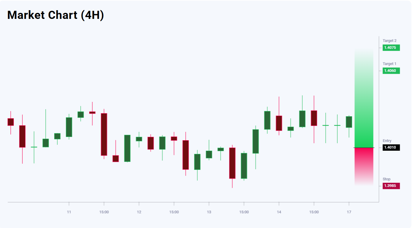 USDCAD juftligidagi o‘sish trendining yakunlangani haqida aniq belgilar yo‘q. Umumiy istiqbol hali ham o‘suvchi (bullish), garchi qisqa muddatli tuzatish yuz berishi mumkin. Shu sababli, afzal strategiya — qisqa orqaga chekinishdan keyin tor stop-loss bilan sotib olish va o‘sish impulsining davom etishini kutishdir. 1.4040 darajasidan yuqoriga chiqish (breakout) o‘sish momentumini tasdiqlaydi. Bugungi USDCAD savdo g‘oyasi kutilayotgan Buy Limit buyurtmasini joylashtirishni tavsiya qiladi.