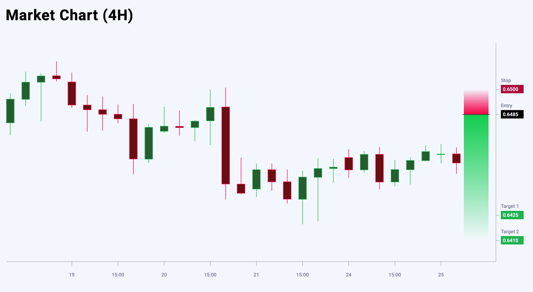 AUDUSD juftligi uchun o‘rta muddatli istiqbol pasayuvchi (bearish) bo‘lib qolmoqda. Vaqtinchalik ko‘tarilish kutilmoqda, yaqin qarshilik darajasi 0.6485 da joylashgan. Biroq joriy darajalarda qisqa pozitsiyalar ochish xavf/foyda nisbati bo‘yicha qulay emas. Afzal strategiya — narx ko‘tarilganda sotish. Bugungi AUDUSD savdo g‘oyasi kutilayotgan Sell Limit buyurtmasini joylashtirishni tavsiya qiladi.