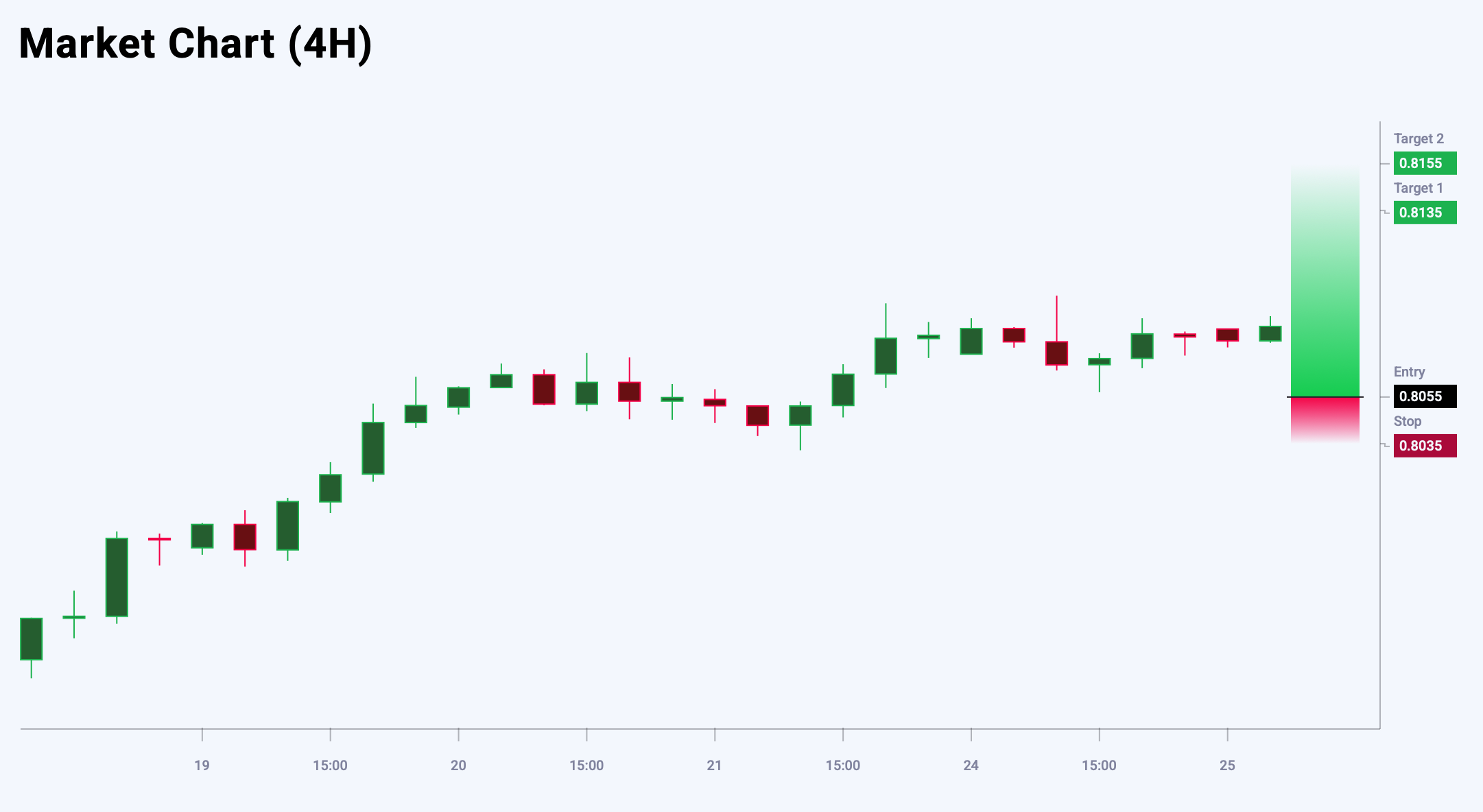 USDCHF juftligi uchun o‘rta muddatli istiqbol o‘suvchi (bullish) bo‘lib qolmoqda, biroq bearish divergentsiya shakllanmoqda, bu esa keyingi o‘sishni cheklashi mumkin. Qisqa muddatli pasayish kutilmoqda, yaqin qo‘llab-quvvatlash darajasi 0.8055 da joylashgan. Joriy darajalarda uzun pozitsiyalar ochish xavf/foyda nisbati bo‘yicha qulay emas. Bugungi USDCHF savdo g‘oyasi kutilayotgan Buy Limit buyurtmasini joylashtirishni tavsiya qiladi.