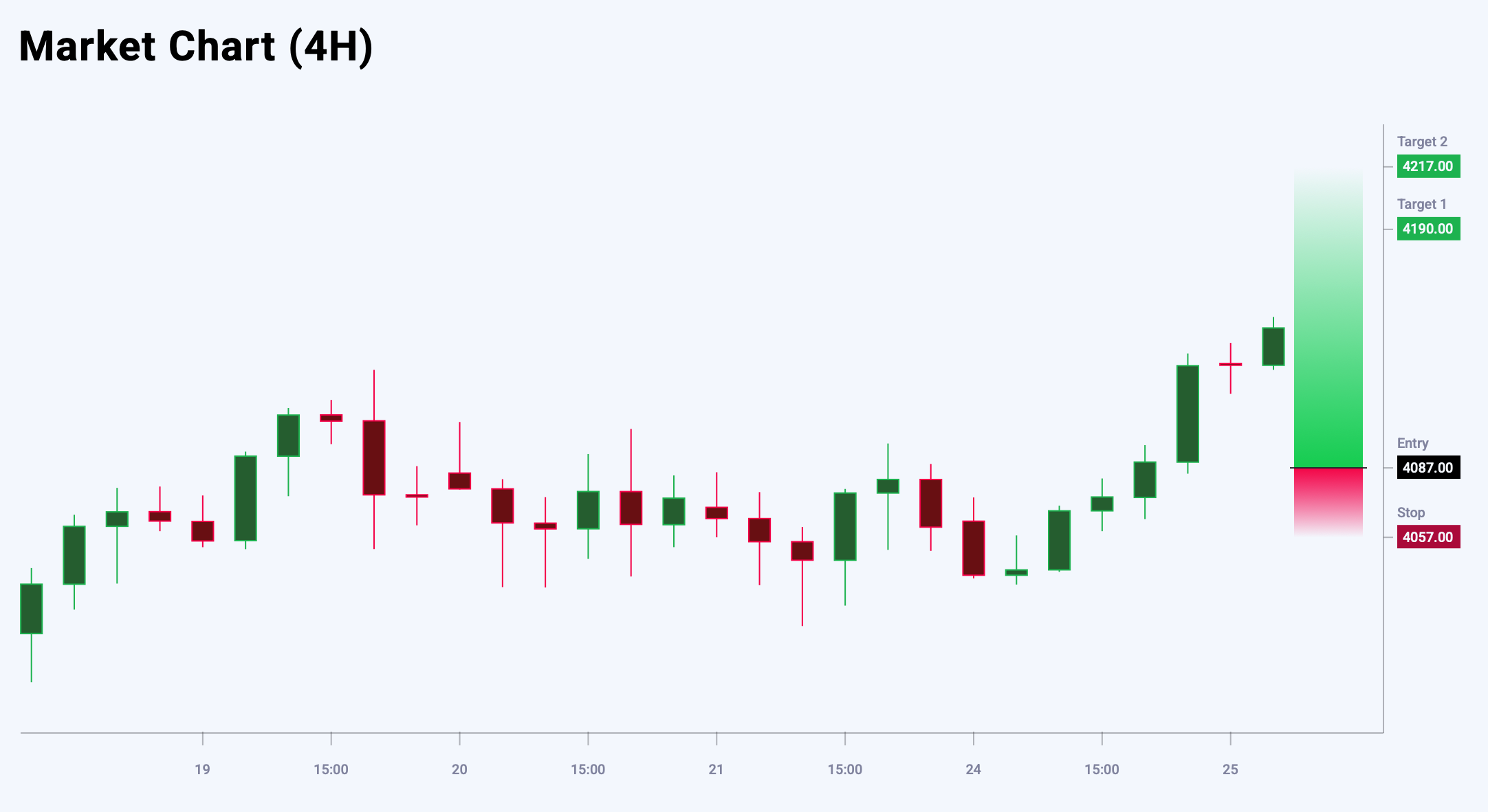 XAUUSD 4 040 USD darajasidan o‘sganidan so‘ng o‘rta muddatli trend o‘suvchi (bullish) bo‘lib qolmoqda va kecha oltin ijobiy dinamikani namoyish etdi. Yaqin qarshilik darajasi 4 143 USD da joylashgan. Afzal strategiya — trend davom etishi uchun orqaga chekinishlarda sotib olish. Bugungi XAUUSD savdo g‘oyasi kutilayotgan Buy Limit buyurtmasini joylashtirishni tavsiya qiladi.