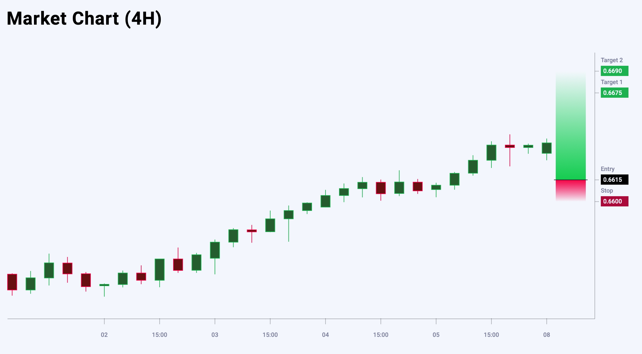 AUDUSD bo‘yicha o‘rta muddatli prognoz o‘sish tomonida qolmoqda. Qisqa muddatda RSI indikatori pasayib bormoqda, bu narxning vaqtinchalik zaiflashishini ko‘rsatishi mumkin. Optimal strategiya — pasayishlarda sotib olish. Asosiy qo‘llab-quvvatlash darajasi 0.6615 da joylashgan. Joriy narxlarda bozorga kirish risk/foyda nuqtai nazaridan ma’qul emas. Bugungi AUDUSD savdo g‘oyasi Buy Limit orderini o‘rnatishni tavsiya qiladi.