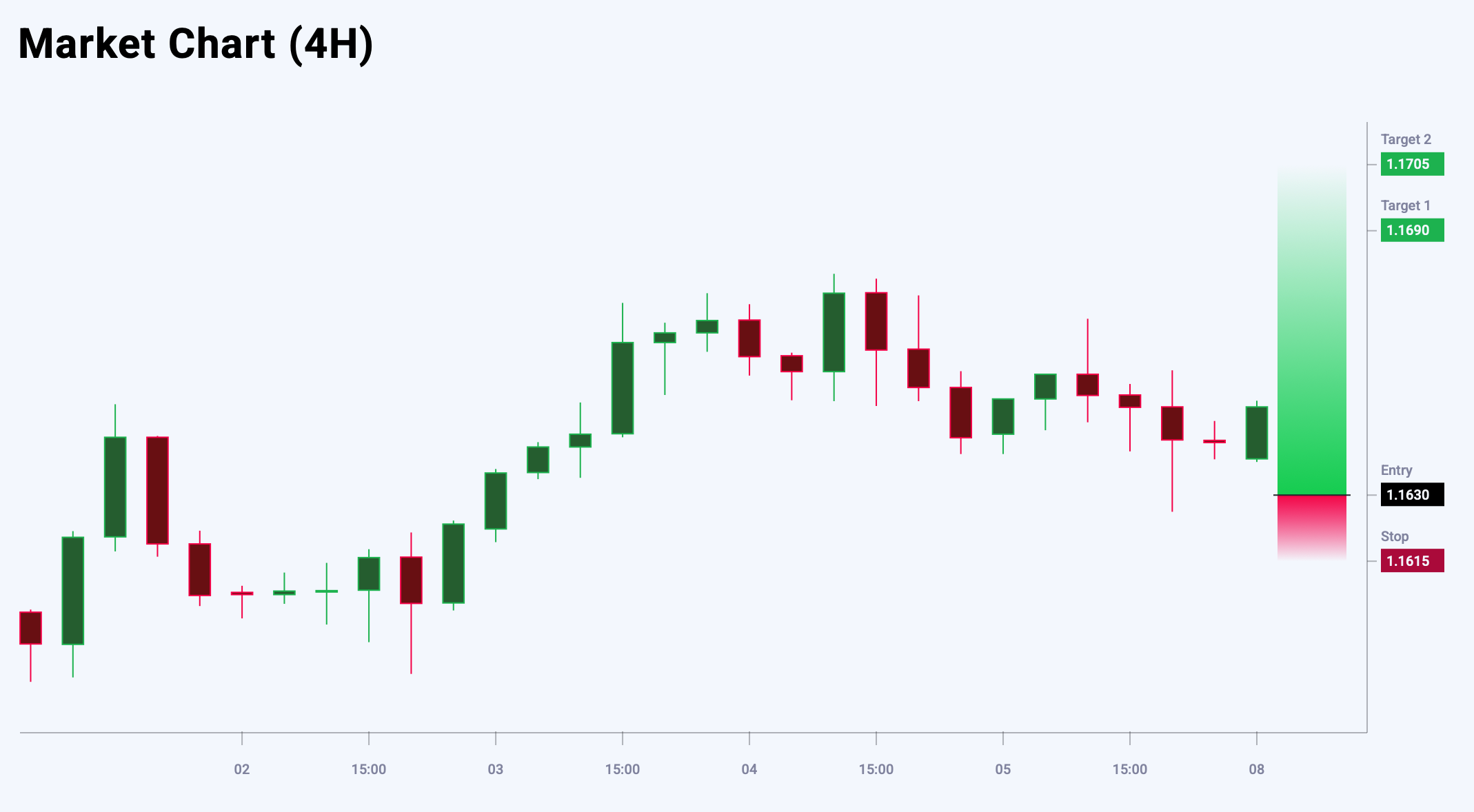 EURUSD juftligida asosiy trend o‘sish yo‘nalishida qolmoqda. Yaqin muddatda narx vaqtinchalik pasayishi mumkin, bu esa qaytishlarda (pullback) sotib olish uchun yaxshi imkoniyat yaratadi. 1.1630 darajasi yaqinida uzun pozitsiyalar ochish optimal deb hisoblanadi. Joriy narxlarda bozorga kirish risk/foyda nisbatiga ko‘ra xavfli, shuning uchun yanada qulay kirish uchun pasayishni kutish maqsadga muvofiqdir. Bugungi EURUSD savdo g‘oyasi Buy Limit orderini o‘rnatishni tavsiya qiladi.