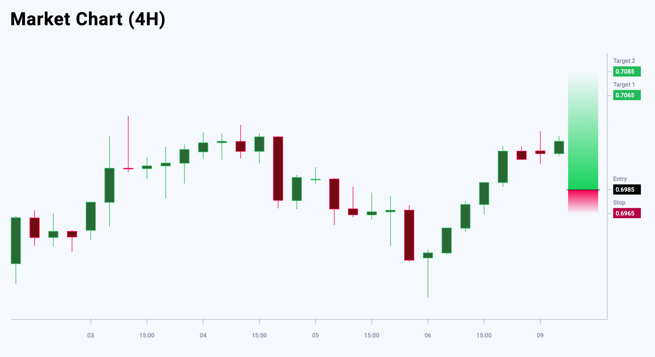 AUDUSD valyuta juftligi uchun asosiy trend bullishligicha qolmoqda. Qisqa muddatda RSI indikatori pasaymoqda. Joriy darajalarda long pozitsiyalarni ochish risk/foyda nisbati nuqtayi nazaridan jozibador emas. Afzal strategiya narxlarning pasayishida xarid qilish hisoblanadi. Asosiy qo‘llab-quvvatlash darajasi 0.6985 da joylashgan. Bugungi AUDUSD savdo g‘oyasi pending Buy Limit orderini joylashtirishni taklif etadi.