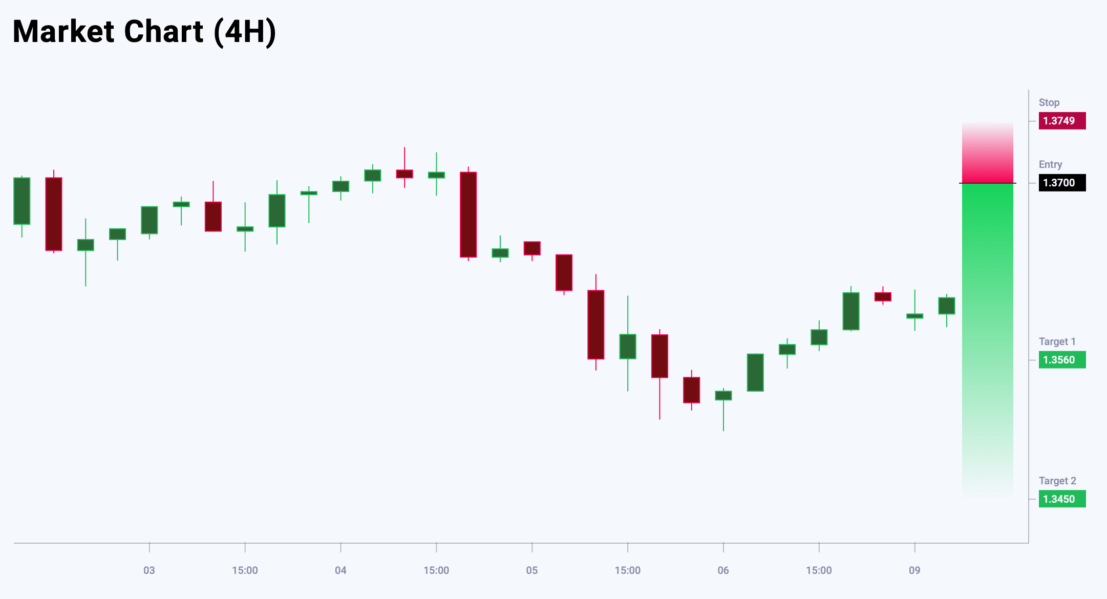 1.3509 qo‘llab-quvvatlash darajasidan boshlangan xarid bosimi GBPUSD kursining so‘nggi pasayishdan keyin tiklanishiga sabab bo‘ldi. Shu bilan birga, Ichimoku indikatori tomonidan ko‘rsatilayotgan qarshilik keyingi o‘sish imkoniyatini cheklamoqda. Joriy darajalarda short pozitsiyalarni ochish risk/foyda nisbati jihatidan jozibador emas. Shu sababli, afzal strategiya narxlar o‘sishida, qattiq stop-loss bilan, qayta bearish impulsni kutgan holda sotishni ko‘rib chiqishdir. Asosiy qarshilik darajasi 1.3700 atrofida joylashgan. Bugungi GBPUSD savdo g‘oyasi pending Sell Limit orderini joylashtirishni taklif etadi.
