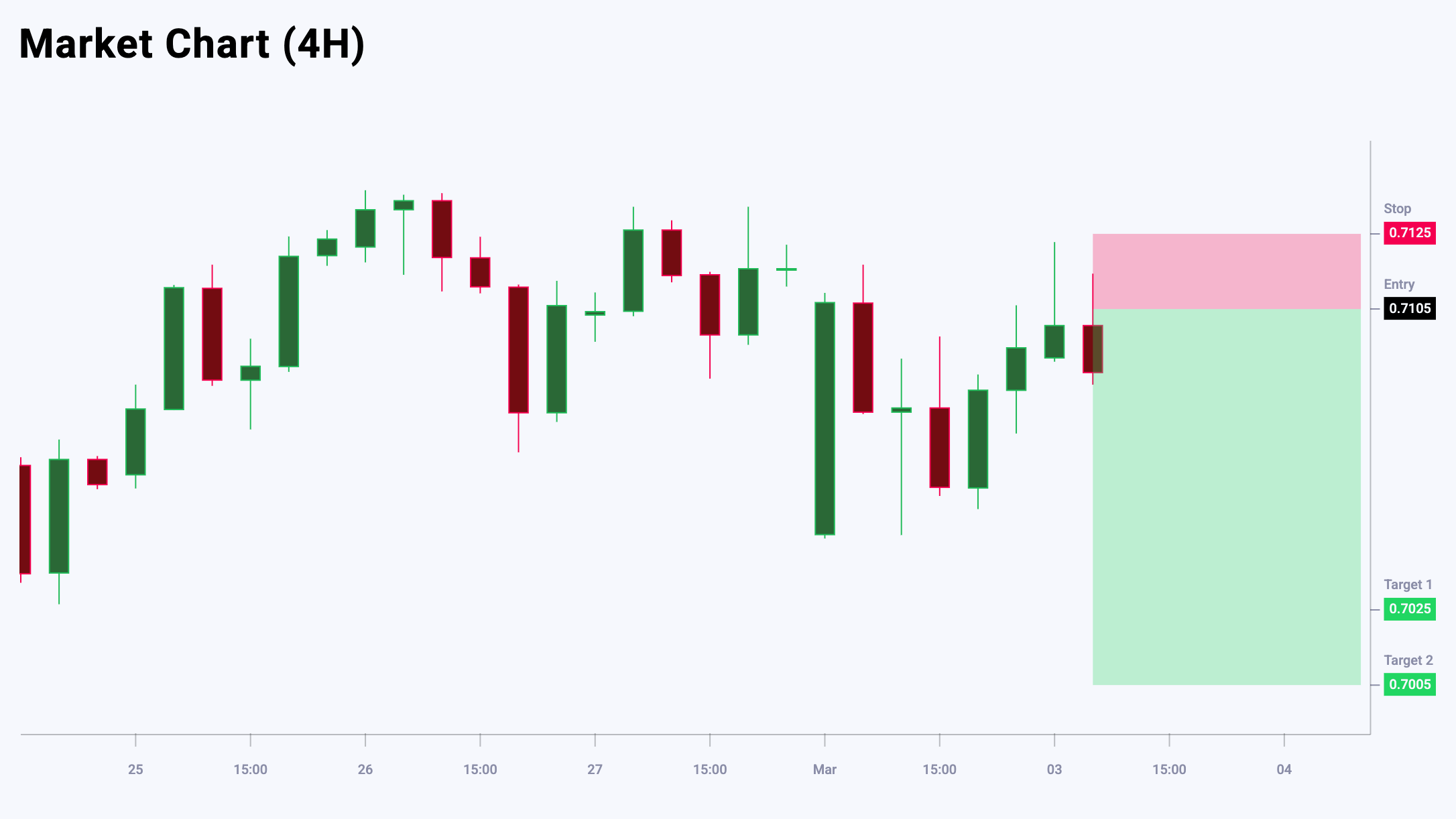 AUDUSD juftligi lokal maksimum shakllantirmoqda, bu esa joriy yuqoriga harakat yakunlanishi mumkinligini bildiradi. Keyingi o‘sishlar kechagi maksimum bilan cheklanishi mumkin, u qarshilik darajasi sifatida xizmat qilmoqda. Qisqa muddatli RSI o‘sishda davom etmoqda, bu esa vaqtinchalik overbought holatni va bearish korreksiya xavfining oshganini ko‘rsatadi. Eng yaqin asosiy qarshilik darajasi 0.7105 da joylashgan bo‘lib, aynan shu hududda sotuv bosimi kuchayishi kutilmoqda. Ushbu vaziyatda optimal strategiya — narx o‘sishida sotish. Bugungi AUDUSD savdo g‘oyasi pending Sell Limit orderini joylashtirishni nazarda tutadi.