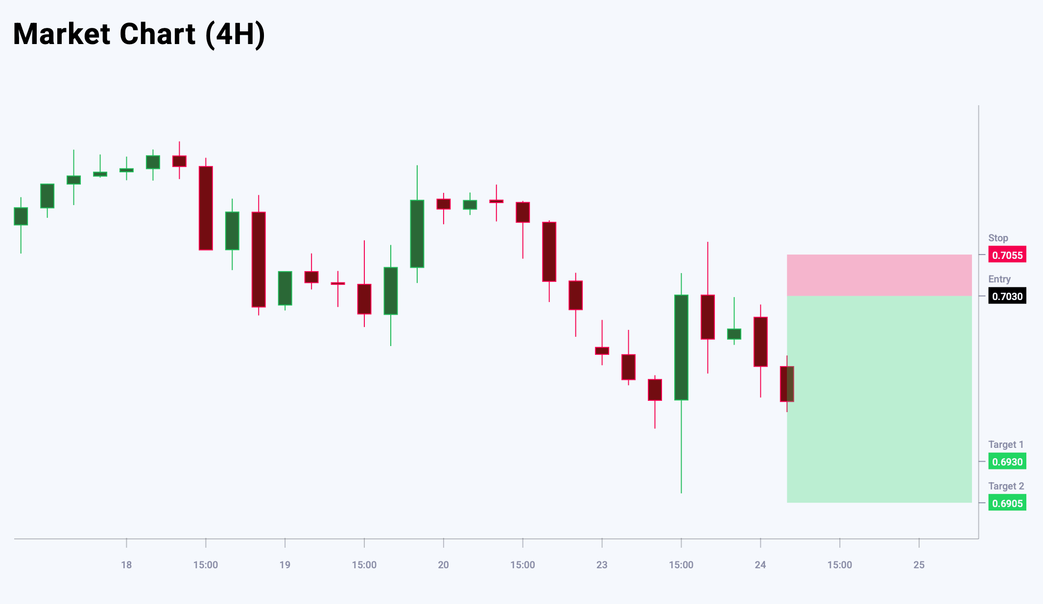 AUDUSD valyuta juftligi o‘rta muddatli bullish yo‘nalishni saqlab qolmoqda, biroq joriy o‘sishlar ehtimol oldingi kun maksimumi bilan cheklanadi. Bu esa joriy darajalardan yuqorida taklif zonasi mavjudligini va qarshilik darajalariga qayta yaqinlashganda sotuvchilar paydo bo‘lish ehtimolini ko‘rsatadi. Kengroq bullish fon mavjud bo‘lsa-da, joriy darajalarda short pozitsiyalar ochish uchun risk/foyda nisbati yetarli darajada jozibador emas, bu esa tasdiqsiz agressiv sotishni kamaytiradi. Asosiy strategiya — o‘sishlarda va pullbacklarda sotish imkoniyatlarini izlash. Lokal qarshilik zonasi 0.7030 atrofida joylashgan bo‘lib, aynan shu yerda sotuvchilar faolligi oshishi va lokal burilish bosimi yuzaga kelishi mumkin. Bugungi AUDUSD savdo g‘oyasi pending Sell Limit orderini joylashtirishni nazarda tutadi.