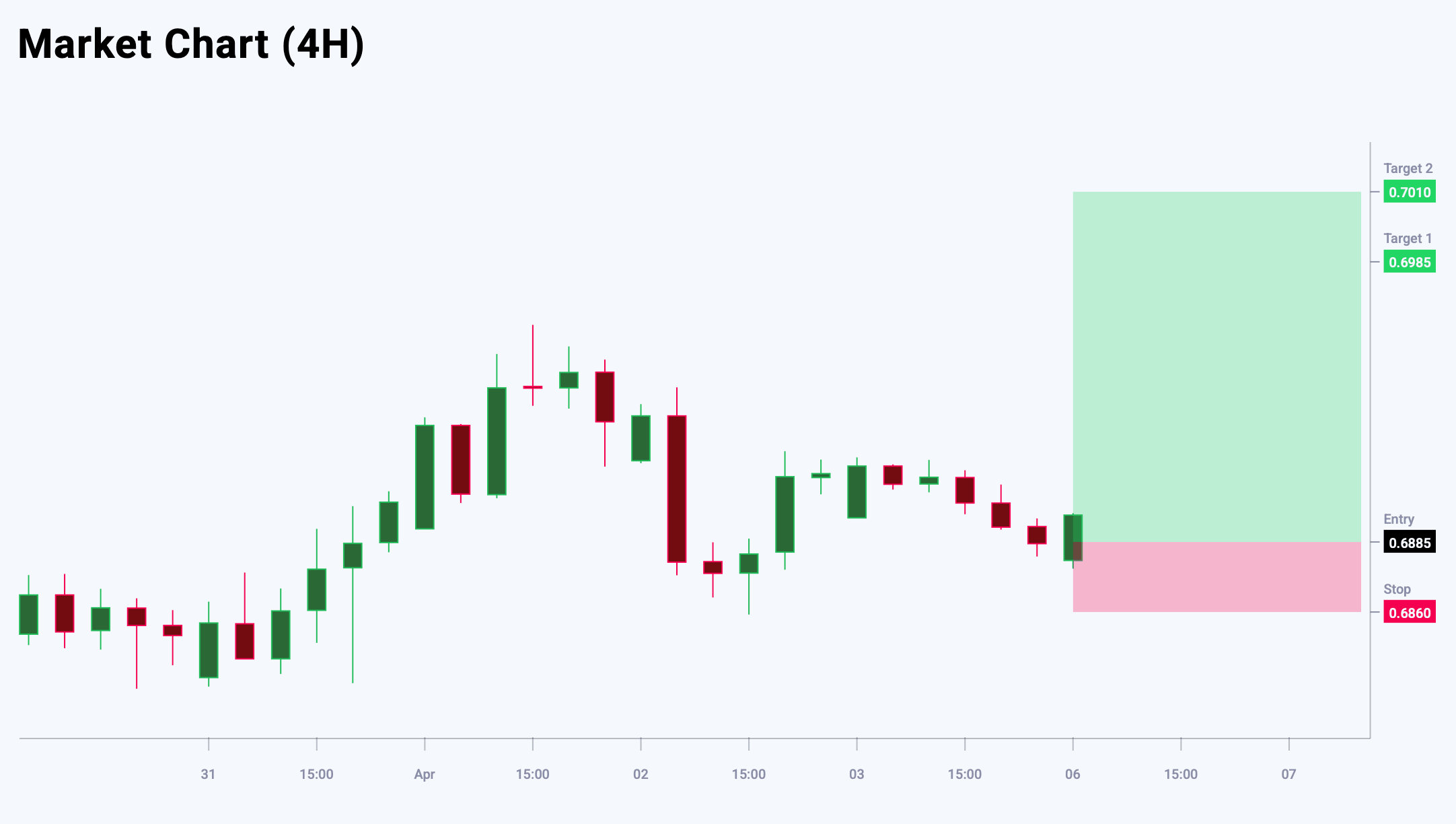 AUDUSD juftligi hali ham sotuvchilar nazorati ostida, ammo bearish impulsning sekinlashuvi bosimning kamayayotganini va ehtimoliy burilish uchun sharoit yaralayotganini ko‘rsatadi. Joriy narx harakati lokal pastki daraja shakllanishiga urinayotganini bildiradi, bu esa korreksion o‘sish ehtimolini oshiradi. Biroq, hozirgi darajalarda long pozitsiyalar ochish risk/foyda nuqtai nazaridan jozibador emas. Eng to‘g‘ri yondashuv — chuqurroq pasayishni kutib, keyin xarid qilish. Muhim qo‘llab-quvvatlash zonasi 0.6885 atrofida joylashgan. Bugungi AUDUSD savdo g‘oyasi pending Buy Limit orderini joylashtirishni nazarda tutadi.