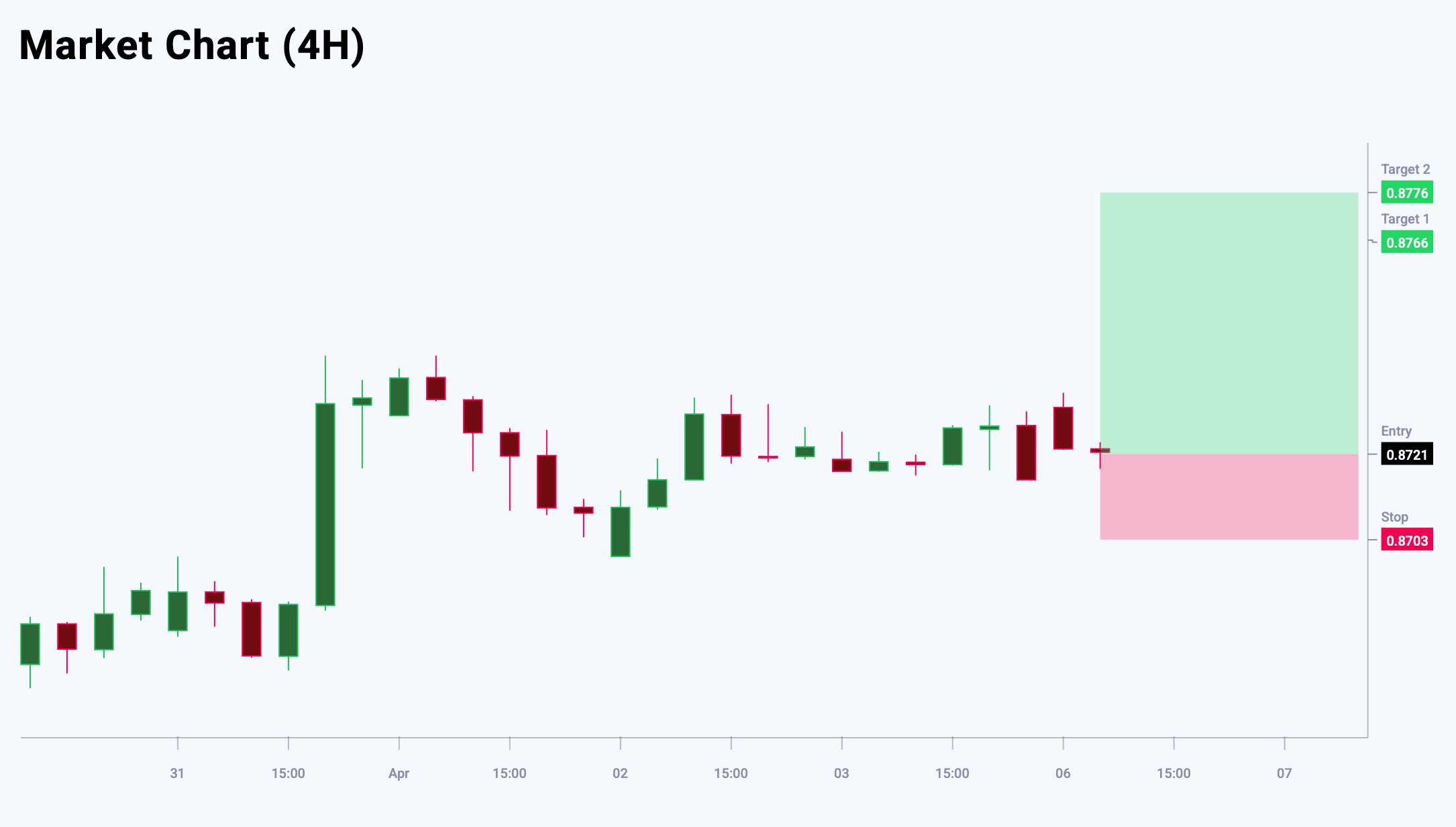 EURGBP valyuta juftligi o‘sish potensialini saqlab qolmoqda, bullish impuls yakunlanganini ko‘rsatadigan aniq signallar yo‘q. Foyda olishlar kuzatilganiga qaramay, pasayish cheklangan bo‘lib qoldi, bu esa barqaror talabni tasdiqlaydi. Texnik ko‘rinish ham bullish ssenariyni qo‘llab-quvvatlaydi: H4 grafikda 20-period EMA 0.8718 atrofida joylashgan va dinamik qo‘llab-quvvatlash vazifasini bajarmoqda. Ushbu darajadan yuqorida ushlanish keyingi o‘sish ehtimolini oshiradi. Bugungi EURGBP savdo g‘oyasi pending Buy Limit orderini joylashtirishni nazarda tutadi.