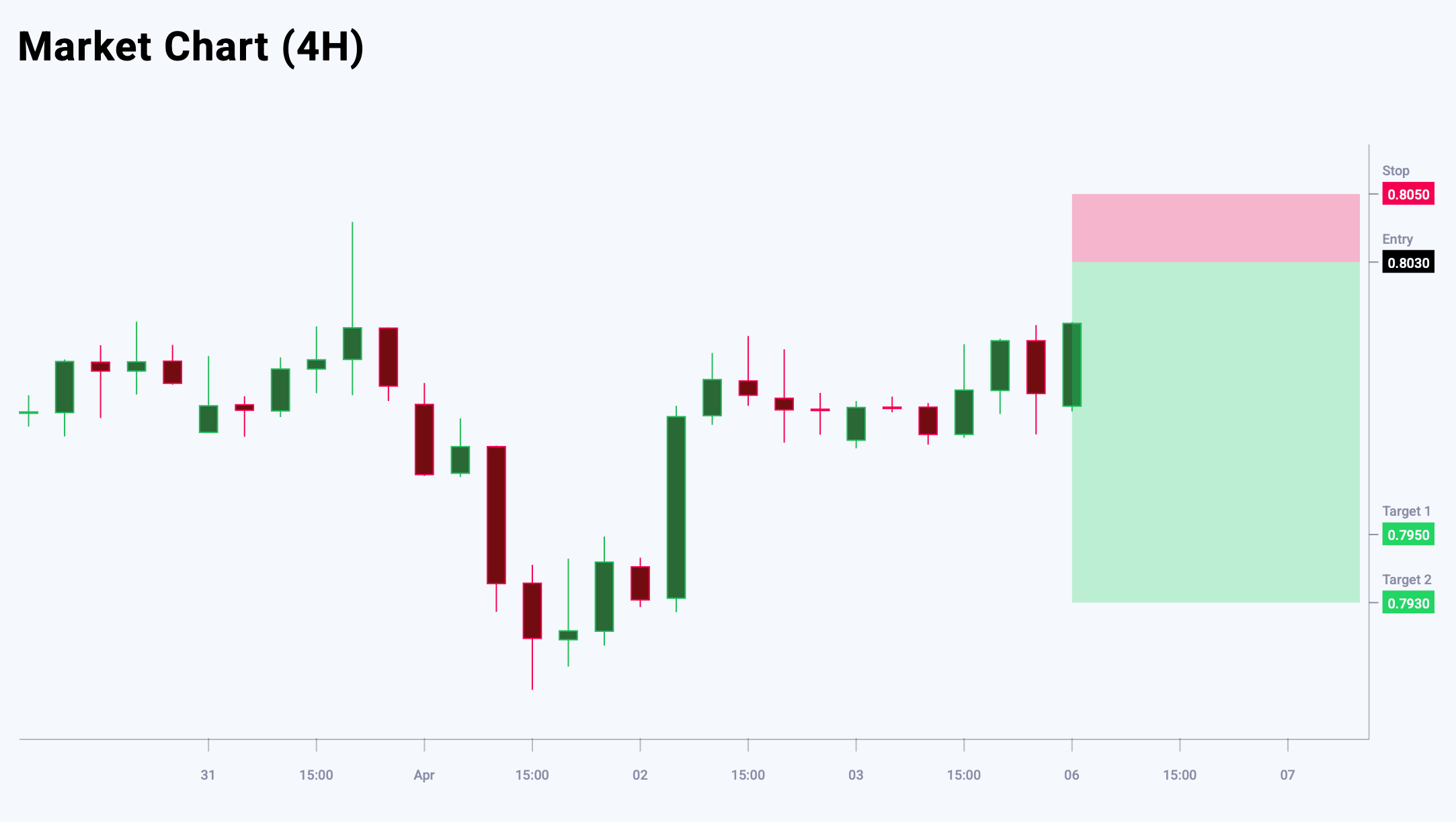 USDCHF valyuta juftligi lokal cho‘qqi shakllantirayotganga o‘xshaydi, bu esa yaqin muddatda pasayishni keltirib chiqarishi mumkin. Qisqa muddatda esa biroz o‘sish ehtimoli saqlanib qoladi va bu short pozitsiyalar uchun qulayroq kirish imkonini beradi. Muhim texnik qarshilik darajasi 0.8030 atrofida joylashgan bo‘lib, aynan shu yerda sotuv bosimi kuchayishi mumkin. Bugungi strategiya — o‘sishlarda sotish. Bugungi USDCHF savdo g‘oyasi pending Sell Limit orderini joylashtirishni nazarda tutadi.