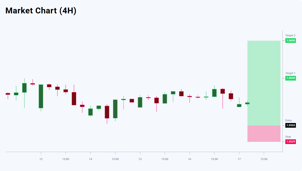 GBPCHF tahlili shuni ko‘rsatadiki, narx lokal cho‘qqi shakllantirayotgan bo‘lishi mumkin, shuning uchun qisqa muddatli pasayish korreksiyasi ehtimoli mavjud. Biroq, intraday grafik hali ham yon tomonga konsolidatsiyani ko‘rsatmoqda, bu esa bozor ishtirokchilarining ikkilanishini va aniq yo‘nalishli impuls yo‘qligini bildiradi. Ushbu fon asosida kutilayotgan pasayish to‘liq trend o‘zgarishidan ko‘ra diapazon ichidagi pullback sifatida ko‘rinmoqda. Shu sababli asosiy strategiya — narx 1.0555 qo‘llab-quvvatlash hududiga tushganda pasayishlarda xarid qilish. Bugungi GBPCHF savdo g‘oyasi 1.0555 darajada pending Buy Limit orderini joylashtirishni tavsiya qiladi.