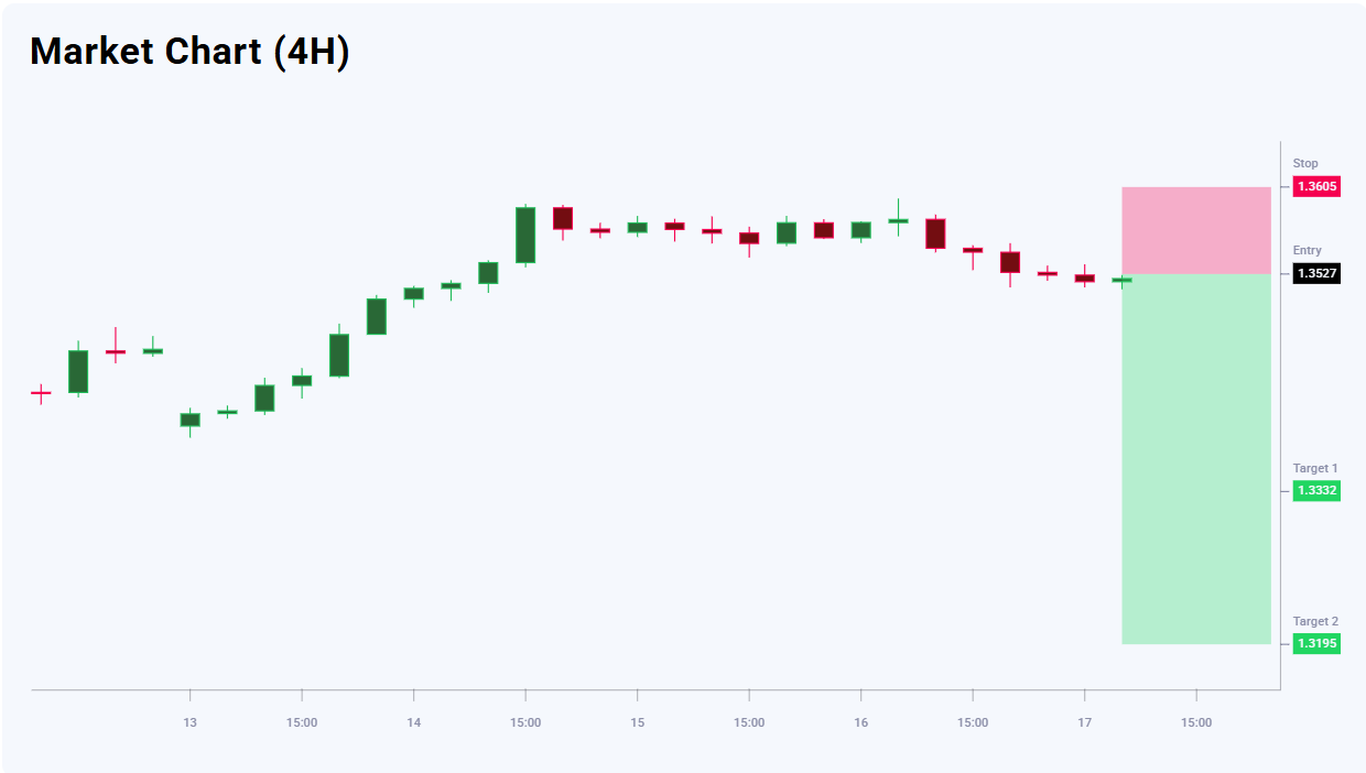 GBPUSD bo‘yicha yangiliklar fonida xaridorlar foydasiga mo‘tadil ustunlik mavjud — 54% ga 46%. Biroq, texnik ko‘rinish qisqa muddatli pasayish ehtimolini ko‘rsatmoqda. Savdo risk/foyda nisbati nuqtai nazaridan jozibador. 1.3332 darajadagi birinchi maqsad 195 pip pasayish potensialini beradi, 1.3195 darajadagi ikkinchi maqsad esa foydani 332 pipgacha oshiradi. 1.3605 darajadagi stop-loss xavfni 78 pip bilan cheklaydi, bu esa taxminan birinchi maqsad uchun 1:2.5 va ikkinchi maqsad uchun 1:4.3 risk/foyda nisbatiga teng.