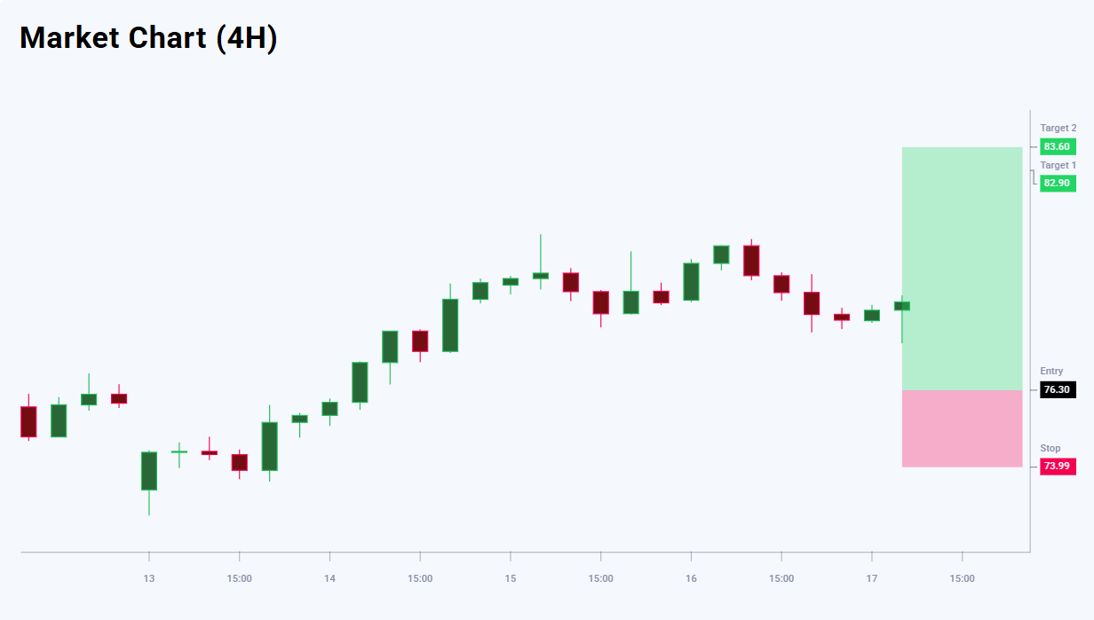 XAGUSD bo‘yicha yangiliklar fonida sotuvchilar foydasiga mo‘tadil ustunlik mavjud — 56% ga 44%. Biroq, texnik ko‘rinish korreksiyadan keyin trend yana yuqoriga davom etishini ko‘rsatadi. Savdo risk/foyda nisbati nuqtai nazaridan o‘rtacha jozibador. 82.90 darajadagi birinchi maqsad 660 pip o‘sish potensialini beradi, 83.60 darajadagi ikkinchi maqsad esa foydani 730 pipgacha oshiradi. 73.99 darajadagi stop-loss xavfni 231 pip bilan cheklaydi, bu esa birinchi maqsad uchun 1:2.9 va ikkinchi maqsad uchun 1:3.2 risk/foyda nisbatiga teng.