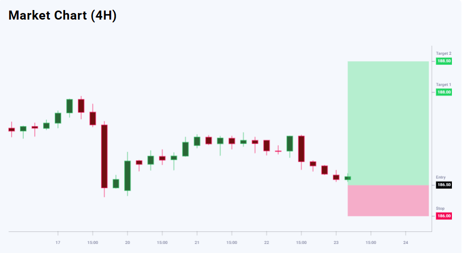 EURJPY bo‘yicha yangiliklar fonida xaridorlar foydasiga ustunlik mavjud (55% ga 45%), texnik ko‘rinish esa korreksiyadan so‘ng yana o‘sish imkonini ko‘rsatmoqda. Savdo risk/foyda nuqtai nazaridan o‘rtacha jozibador. 188.00 darajadagi birinchi maqsad 150 pip o‘sish potensialini beradi, 188.50 darajadagi ikkinchi maqsad esa foydani 200 pipgacha oshiradi. 186.00 darajadagi stop-loss xavfni 50 pip bilan cheklaydi, bu esa birinchi maqsad uchun 1:3 va ikkinchi maqsad uchun 1:4 risk/foyda nisbatiga mos keladi.