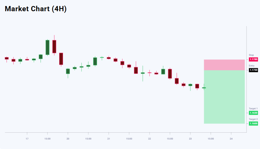 EURUSD bo‘yicha yangiliklar fonida sotuvchilar aniq ustunlikka ega (65% ga 35%), bu pasayuvchi prognozni tasdiqlaydi. Texnik ko‘rinish ham ehtimoliy korreksiyadan so‘ng pasayish davom etishini ko‘rsatadi. Savdo risk/foyda nuqtai nazaridan jozibador. 1.1630 darajadagi birinchi maqsad 120 pip foyda potensialini beradi, 1.1600 darajadagi ikkinchi maqsad esa foydani 150 pipgacha oshiradi. 1.1780 darajadagi stop-loss xavfni 30 pip bilan cheklaydi, bu esa birinchi maqsad uchun 1:4 va ikkinchi maqsad uchun 1:5 risk/foyda nisbatiga teng.