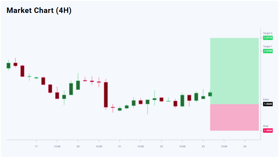 USDCAD bo‘yicha yangiliklar fonida xaridorlar foydasiga ustunlik mavjud (56% ga 44%). Texnik ko‘rinish sotuvchilarning charchaganini va yuqoriga qaytish kutilayotganini ko‘rsatadi. Savdo risk/foyda nuqtai nazaridan o‘rtacha jozibador. 1.3750 darajadagi birinchi maqsad 100 pip o‘sish potensialini beradi, 1.3775 darajadagi ikkinchi maqsad esa foydani 125 pipgacha oshiradi. 1.3600 darajadagi stop-loss xavfni 50 pip bilan cheklaydi, bu esa birinchi maqsad uchun 1:2 va ikkinchi maqsad uchun 1:2.5 risk/foyda nisbatiga teng.