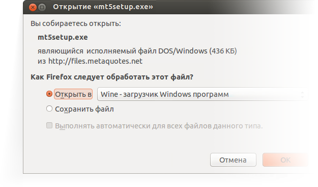 Yuklash yakunlanganidan so‘ng o‘rnatish faylini ishga tushiring. Tizim Microsoft Windows tizimi uchun mo‘ljallangan fayl qo‘llanilayotganligini avtomatik aniqlaydi, va uni Wine yordamida ochishni taklif qiladi. Ushbu variantni tanlang va "OK" bosing.