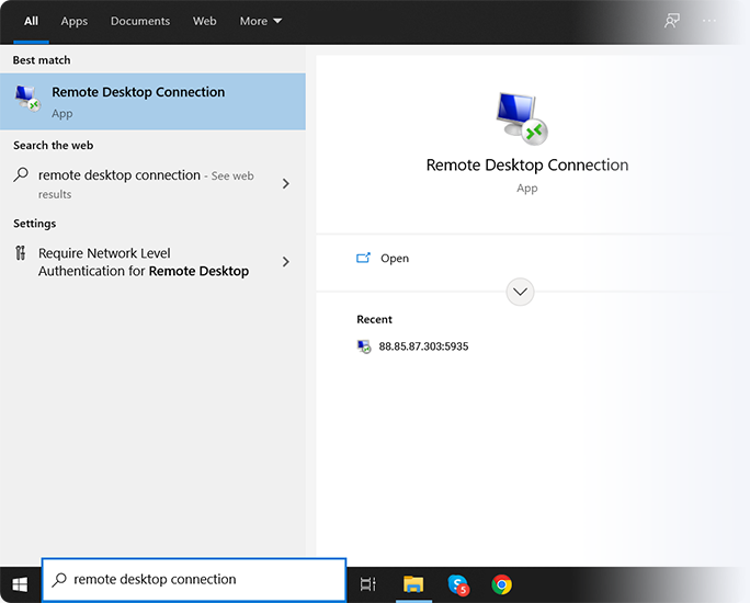 - Qidiruv panelidan foydalanib, Remote Desktop Connection ilovasini toping va uni kompyuteringizda ishga tushiring.