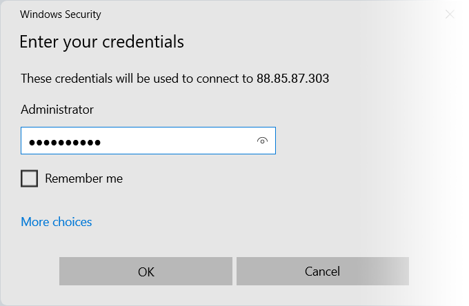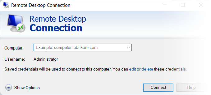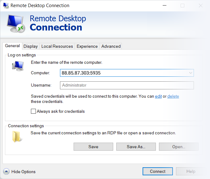 - «Show options» tugmasini bosing va «User name» maydoniga Administrator deb yozing. Siz ulanish har safar amalga oshirilganda maʼlumotlarni saqlashni yoki qayta kiritishni tanlashingiz mumkin. Keyin «Connect» tugmasini bosing.