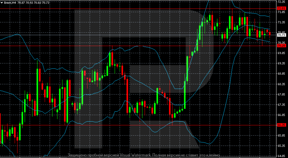 On the H4 chart, Brent prices rebounded from the 66.35 area, formed a strong upward impulse, broke above 70.20, and reached highs near 72.00. The rally was accompanied by widening Bollinger Bands, signalling increased volatility.