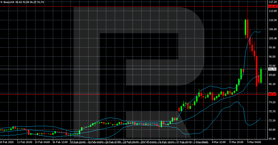 Brent has declined and pulled back from the local high. The Brent forecast for today, 10 March 2026, suggests stabilisation near 91.70.
