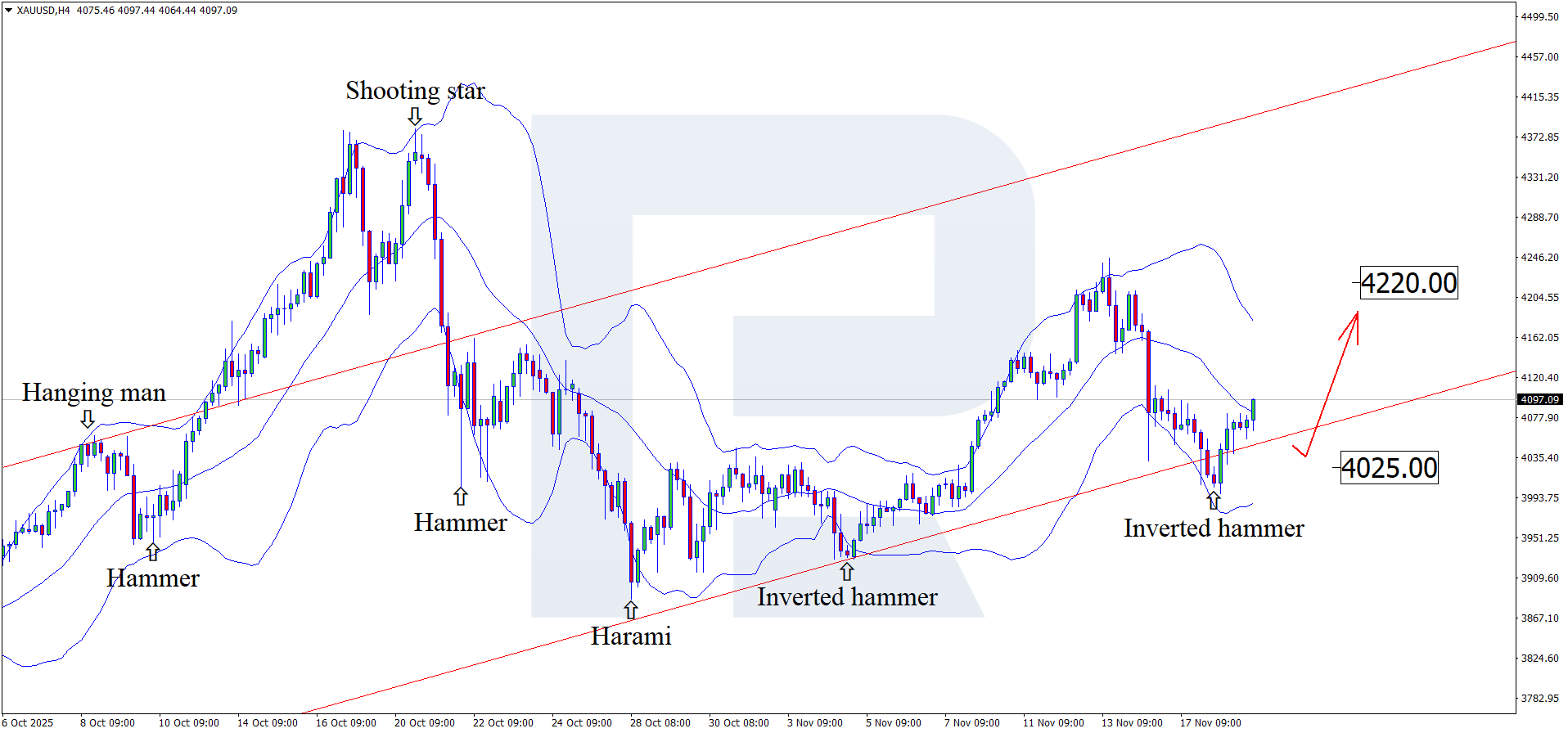 On the H4 chart, XAUUSD prices formed an Inverted Hammer reversal pattern near the lower Bollinger Band. Currently, they continue their upward momentum following the signal from the pattern. Since XAUUSD quotes remain within an ascending channel, the upside target could be 4,220 USD.