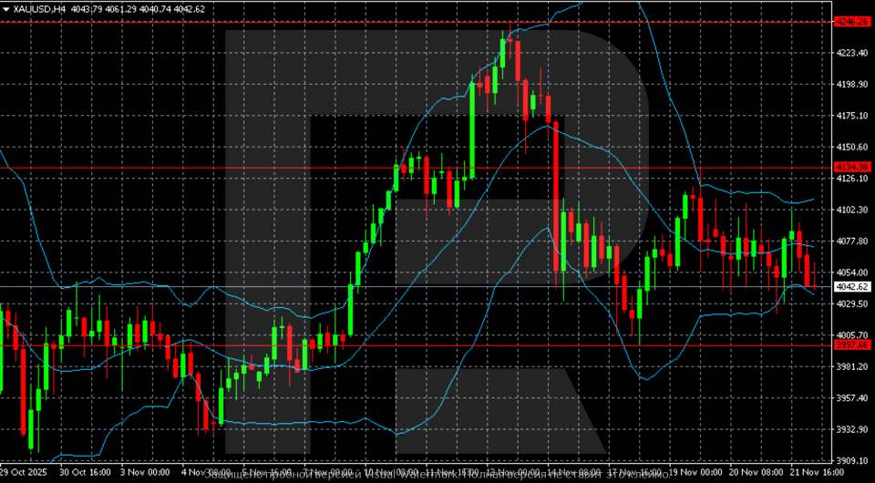 The upper resistance boundary is near 4,134, from where a sharp decline started on 14 November. Since then, gold has failed to return above this level, signalling weak buying momentum. The lower support level lies in the 3,997–4,000 area. In recent days, prices have approached this level more frequently, suggesting gradually increasing selling pressure.