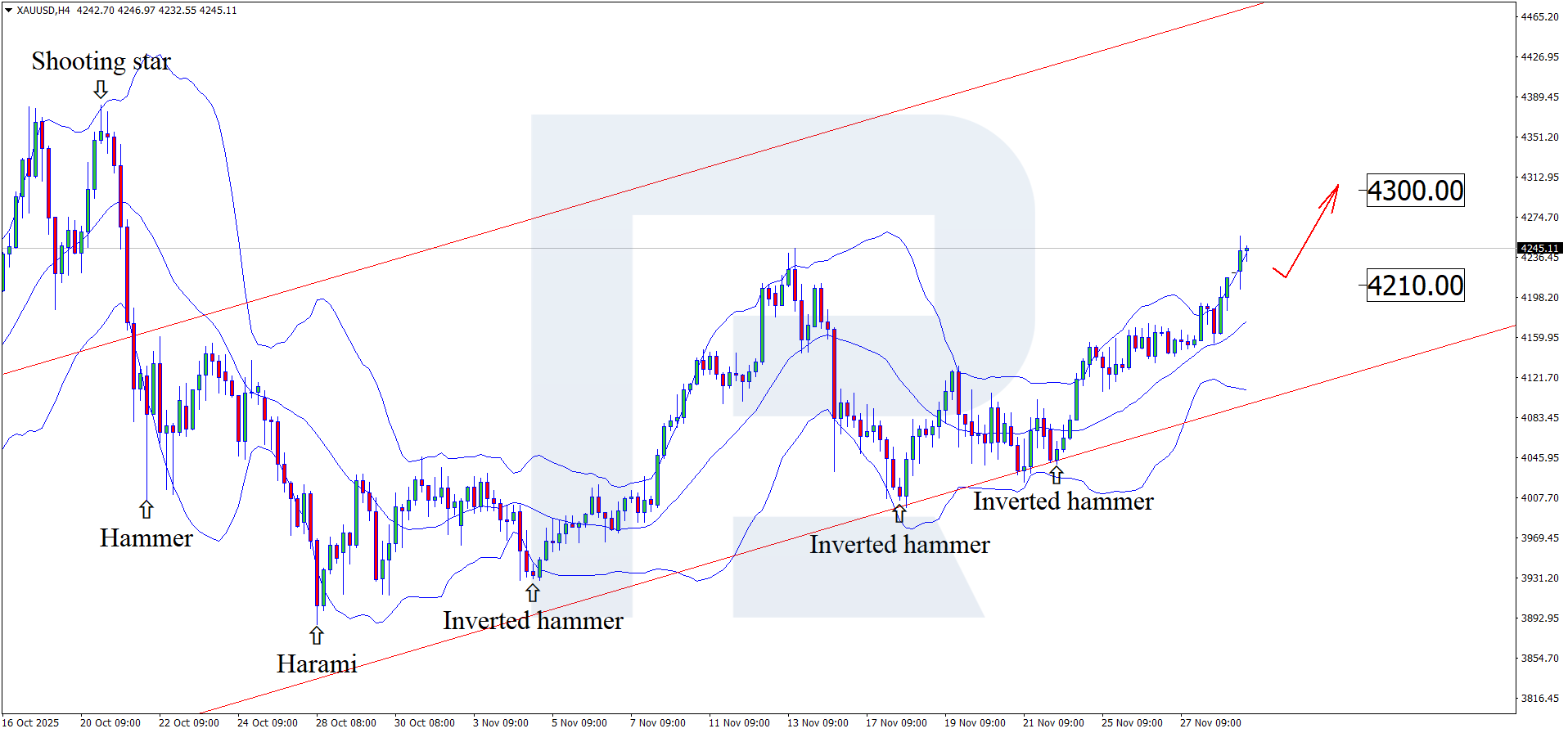 On the H4 chart, XAUUSD prices formed an Inverted Hammer reversal pattern near the lower Bollinger Band. Quotes currently continue an upward wave following this signal. Since XAUUSD remains within the ascending channel, the next upside target could be 4,300 USD.