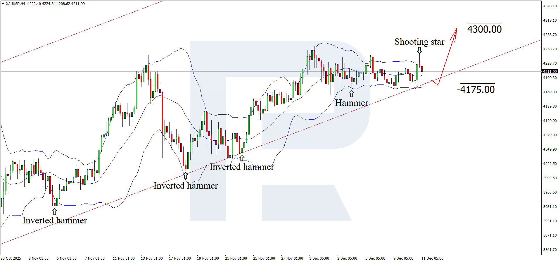 The XAUUSD forecast for 11 December 2025 is neutral. The pair continues to move inside a horizontal channel. Technical analysis suggests considering a correction toward 4,175 USD before the next upward wave.