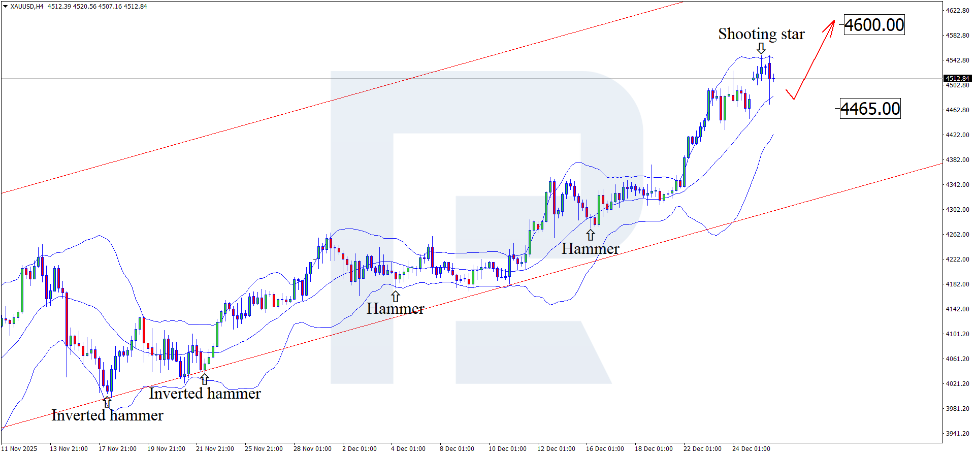 At the same time, XAUUSD technical analysis for today also considers an alternative scenario, where prices extend the rally toward 4,600 USD without testing support.