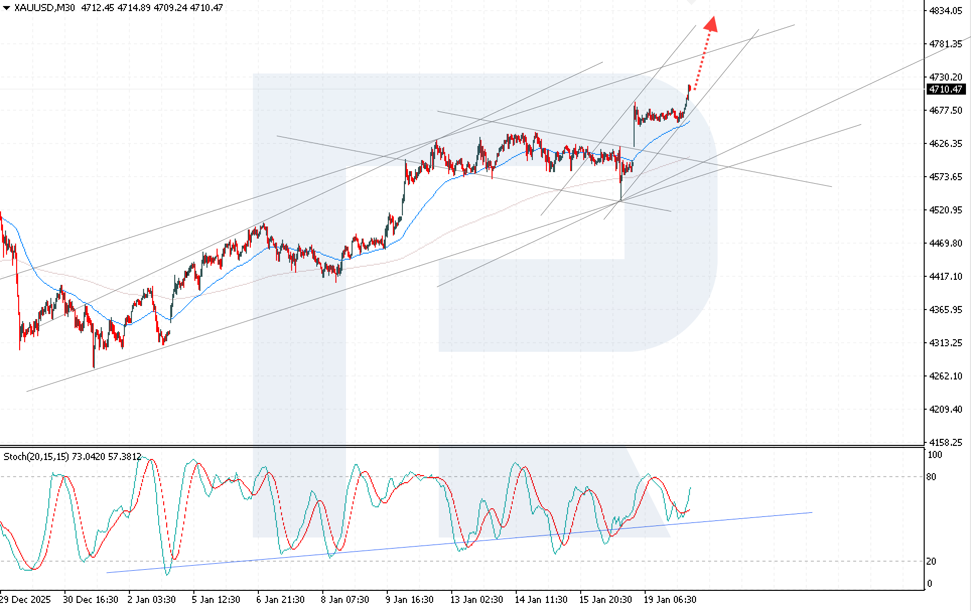 XAUUSD quotes are rising for the second consecutive trading session. Buyers confidently overcame the key resistance level at 4,635 USD, which previously restrained the bullish momentum. Gold receives sustained support due to growing demand for safe-haven assets amid escalating tensions around Greenland.