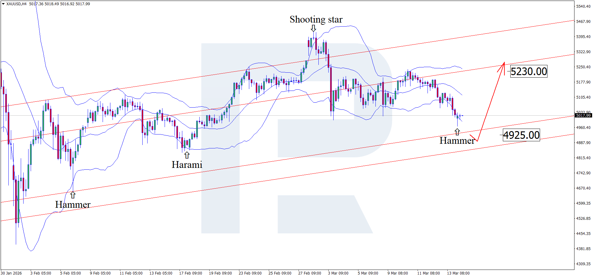 On the H4 chart, XAUUSD prices formed a Hammer reversal pattern near the lower Bollinger Band. In the near term, as the pattern plays out, quotes may build an upward wave and continue their upward momentum. Since XAUUSD remains within an ascending channel, the first upside target could be 5,230 USD.