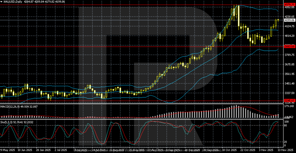 The fundamental backdrop for gold remains confidently positive. After rising nearly 5% over the week, XAUUSD stabilised near a three-week high. The market finds support in expectations of a December Fed rate cut, the delayed release of official statistics due to the US government shutdown, and weak private labour market data.