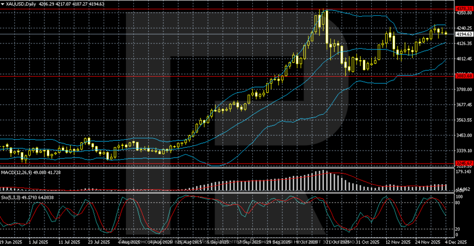 Long positions are justified if prices hold above 4,050, where the Bollinger middle band and nearest dynamic support are located. A breakout above the 4,240–4,250 resistance zone would open the path to retest the all-time high at 4,378. A consolidation above this zone would allow expansion towards 4,400+. Bullish catalysts include dovish Fed statements, the high probability of a December interest rate cut, and weak macroeconomic data reinforcing easing expectations.