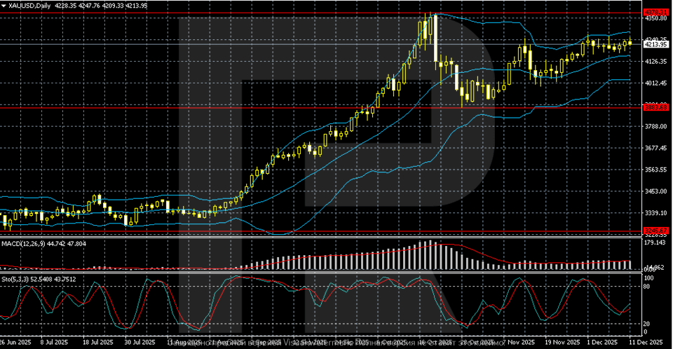 The fundamental backdrop for gold remains positive. Gold (XAUUSD) ends the week near $4230 per ounce — close to October highs. The market was supported by dovish Fed signals: Powell confirmed that only rate cut scenarios are being discussed, with no hikes in sight. Growth forecasts were upgraded and inflation expectations lowered.
