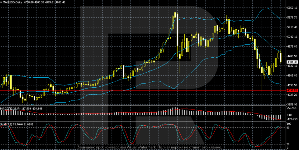From a technical perspective, gold has shifted into a downward correction. After reaching highs near 5,500, prices fell to 4,200–4,300 and rebounded to 4,600. Quotes remain below the middle Bollinger Band, indicating selling pressure. MACD is in negative territory, while the Stochastic Oscillator reflects a short-term bounce. Consolidation within a range is likely, with support at 4,300–4,200 and resistance at 4,800–5,000.