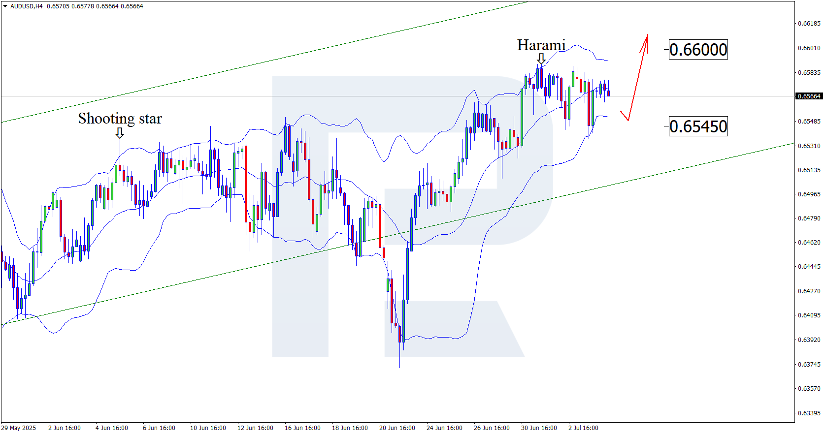 On the H4 chart, AUDUSD tested the upper Bollinger Band and formed a Harami reversal pattern. At this stage, it is developing a corrective wave in line with the received signal. The target for the pullback may be the support level at 0.6545.