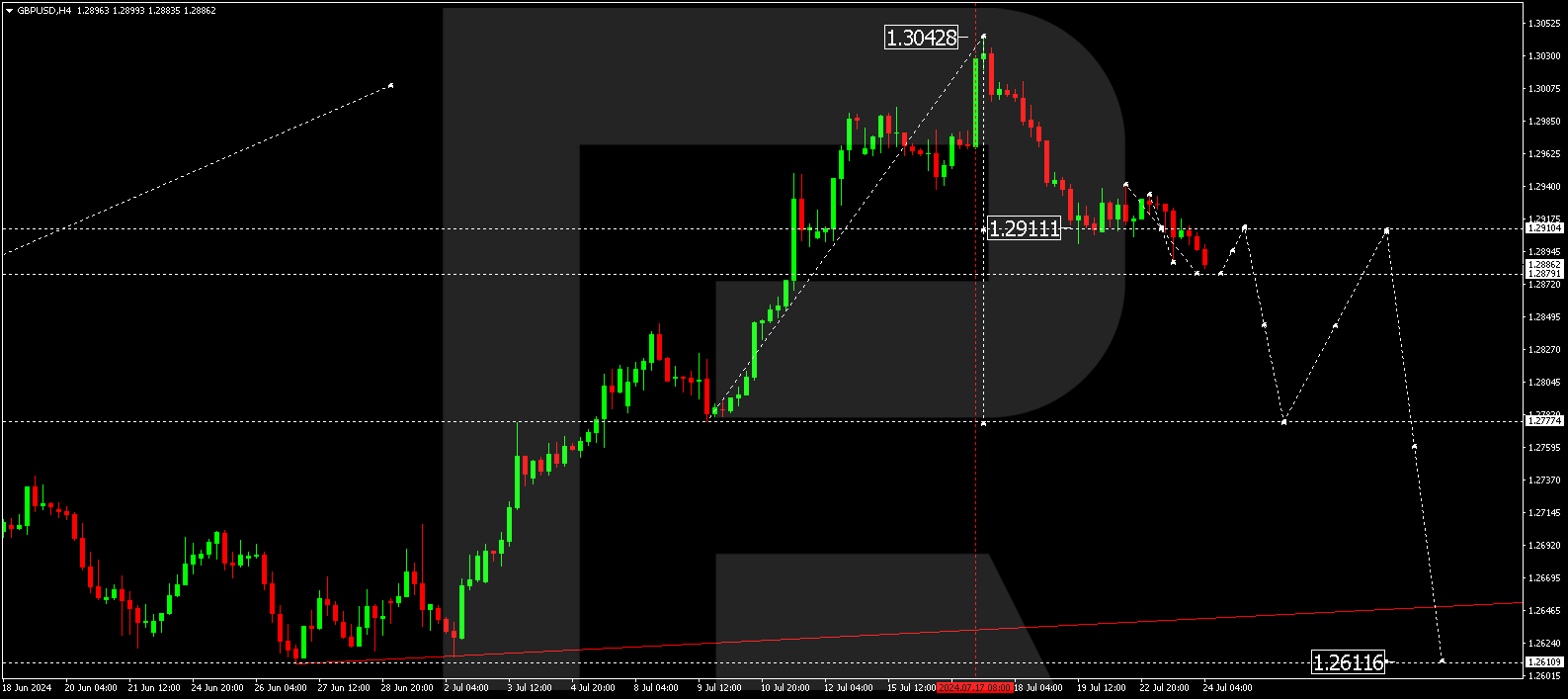 Analysis for 24 July 2024 shows that the GBPUSD pair is forming a consolidation range around 1.2911, which is expected to extend down to 1.2879 today. Subsequently, the price could rise to 1.2911 (testing from below) before the decline wave likely continues to 1.2777, representing the first target.
