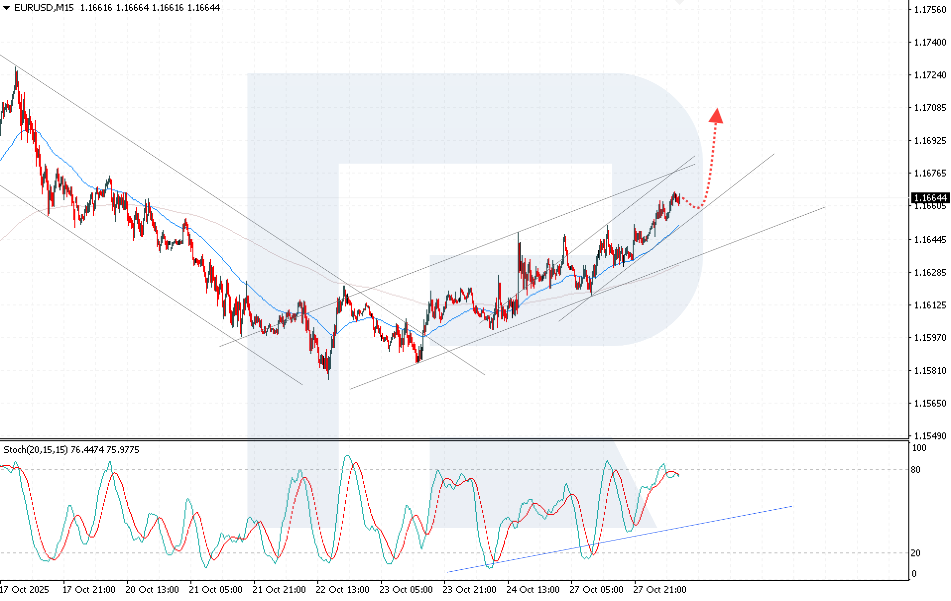 The EURUSD pair continues to recover steadily as demand for the U.S. dollar declines. The current exchange rate stands at 1.1664. More details in our analysis for 28 October 2025.