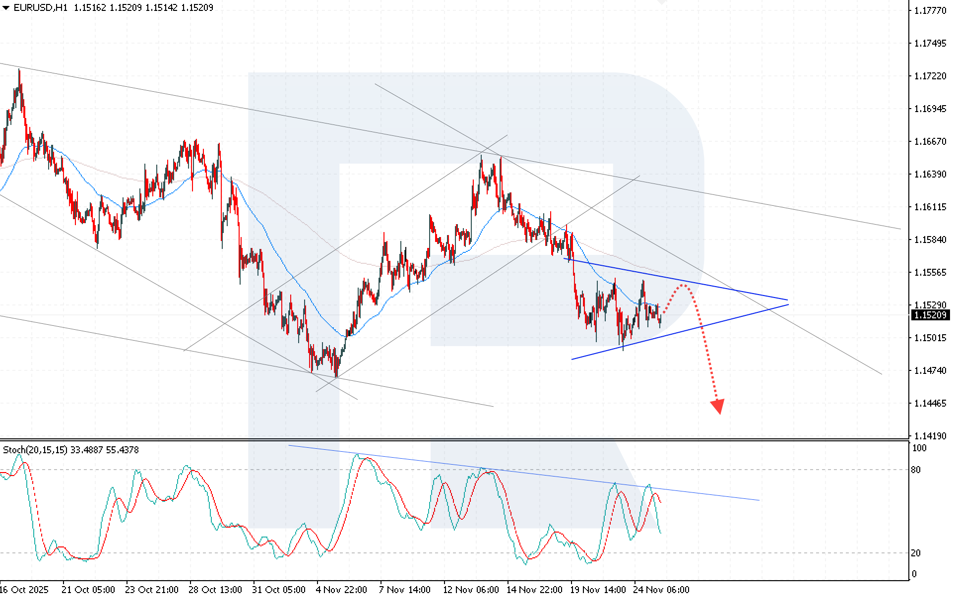 The EURUSD pair continues to correct for the second consecutive session, with investors awaiting key macroeconomic data. The rate currently stands at 1.1520. Find out more in our analysis for 25 November 2025.