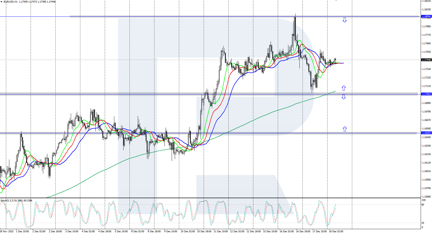 The EURUSD rate is rising moderately, having turned higher from support at 1.1700. Today the market is awaiting the ECB interest rate decision. Details — in our analysis for 18 December 2025.