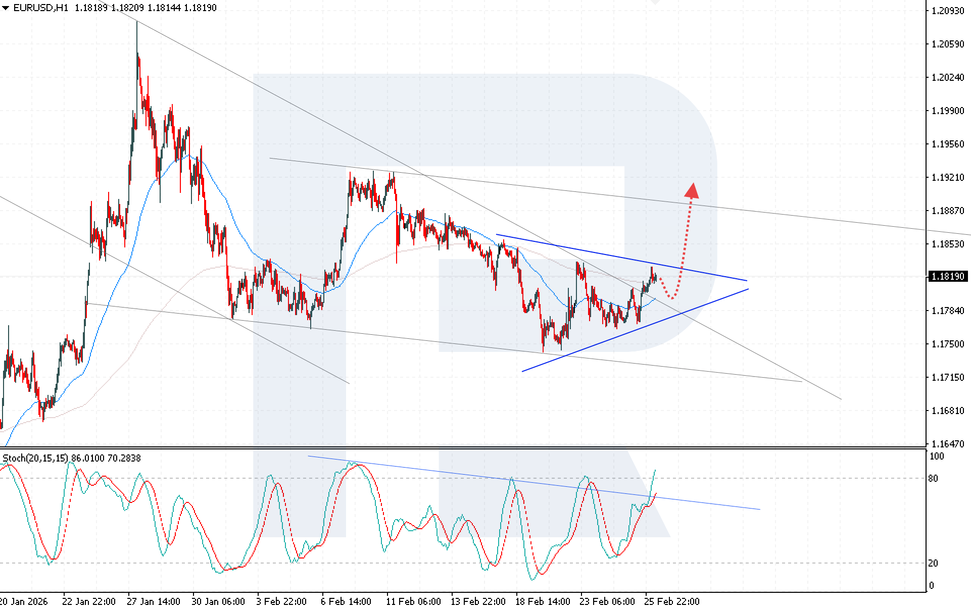 The EURUSD rate is correcting after a strong momentum rally the day before, with buyers preparing to test the key resistance level at 1.1830. Discover more in our analysis for 26 February 2026.