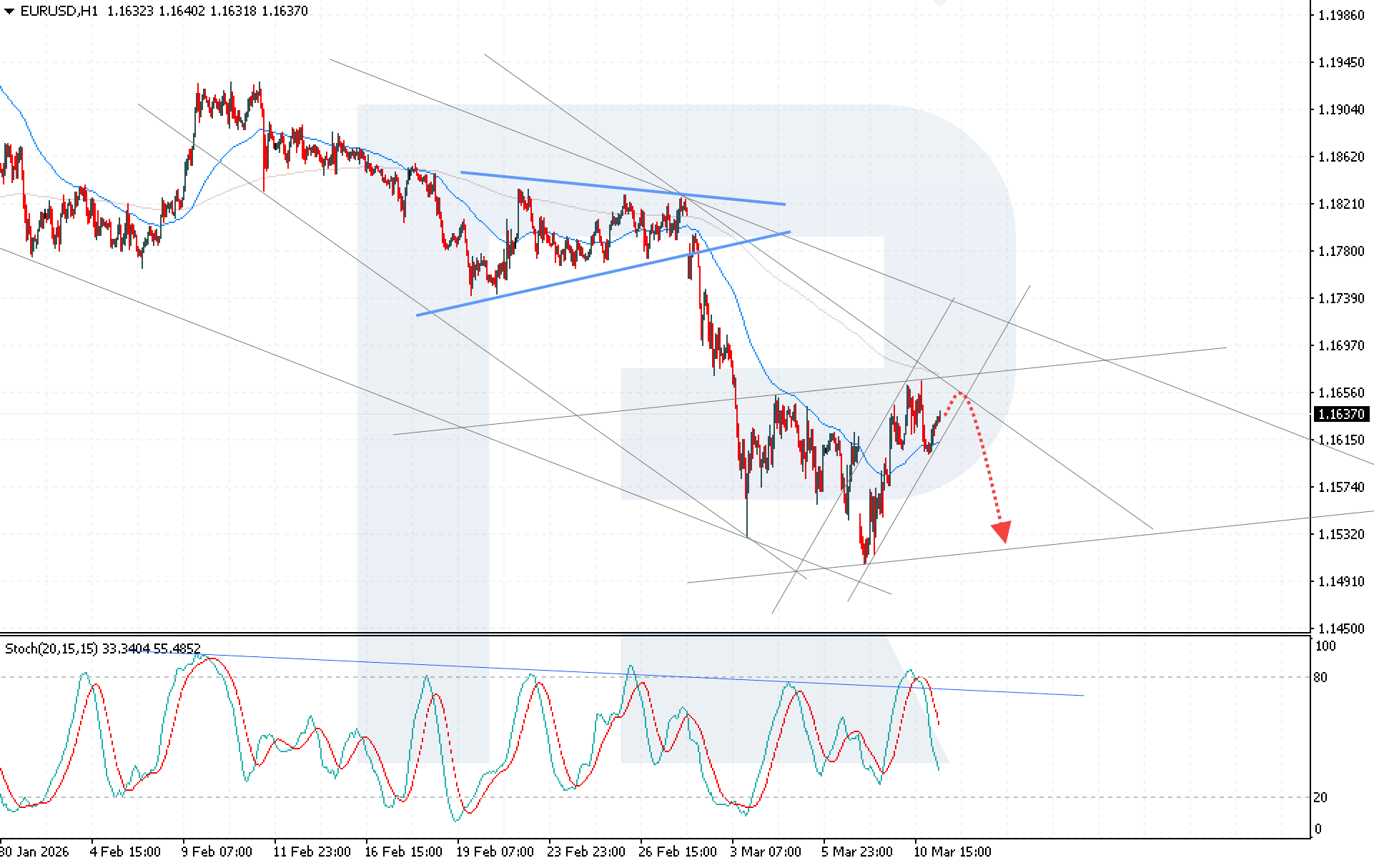 The EURUSD pair remains under pressure amid rising inflation risks, which supports demand for the US dollar. The rate currently stands at 1.1637. Discover more in our analysis for 11 March 2026.