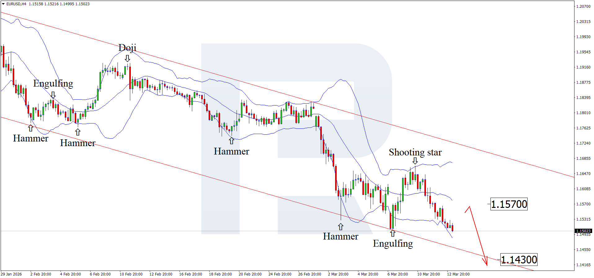 On the H4 chart, while pulling back, the EURUSD pair formed a Shooting Star reversal pattern near the upper Bollinger Band. At this stage, the pair continues its downward momentum as the signal plays out. The downside target may be the 1.1430 level.